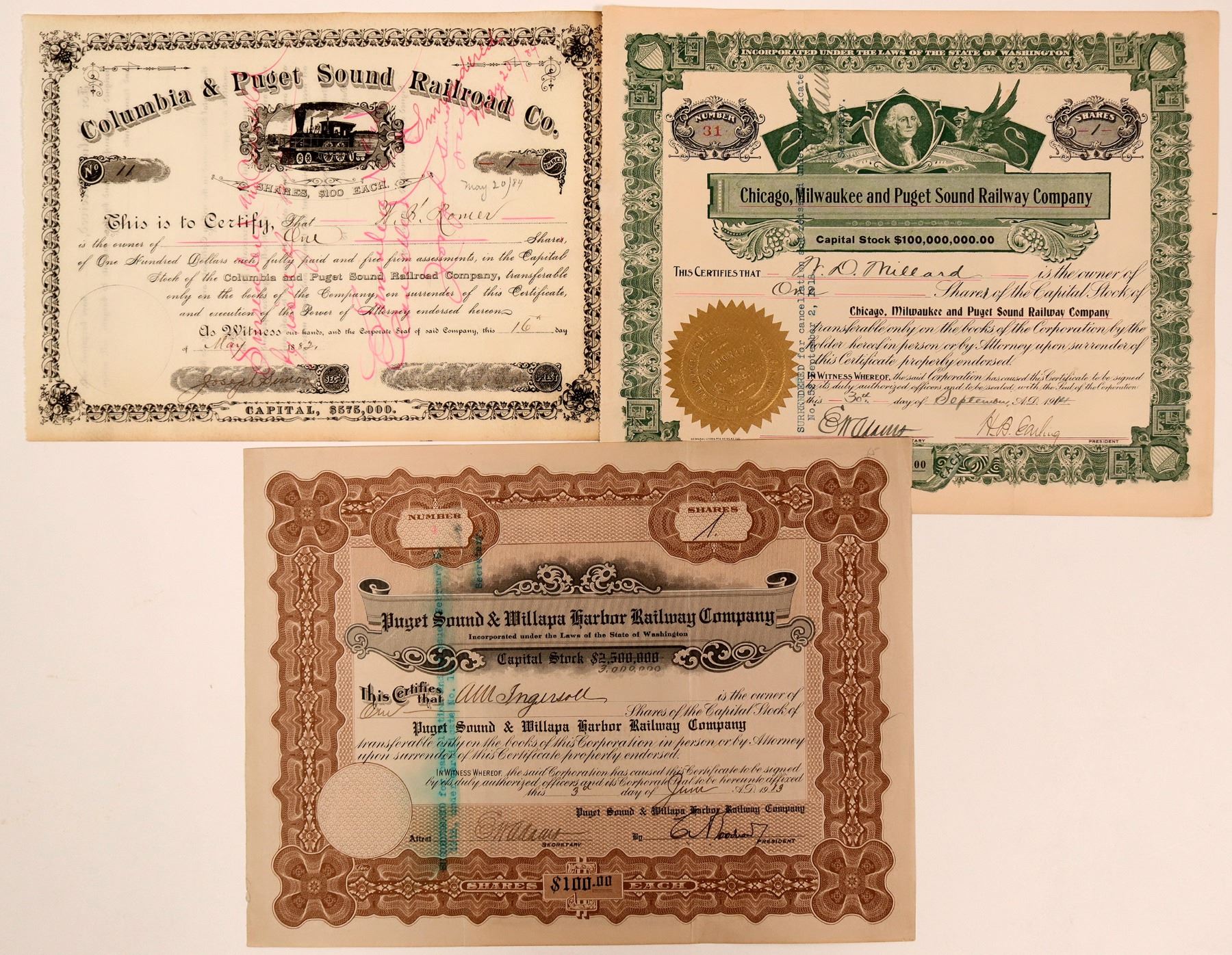 Three stock certs include The Columbia & Puget Sound RR, Chicago, Milwaukee & Puget Sound Ry and The Puget Sound& Millapa Valley RR Co. The last two have custom stamps affixed. All are in good condition.