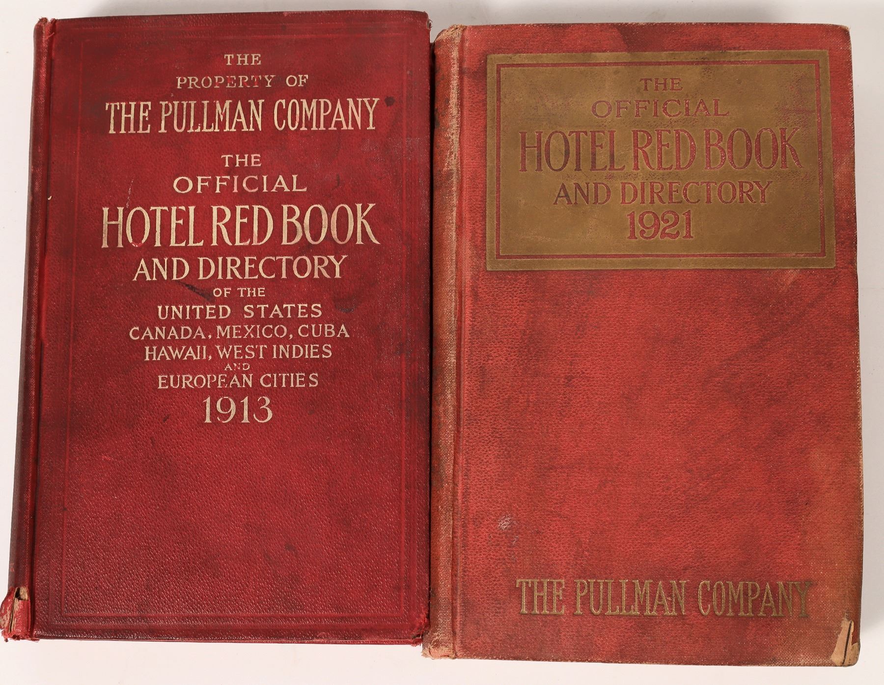 Two volumes of the Pullman Company's Official Hotel Red Book and Directory. Because rail was a popular mode of transportation in the early 20th century, Pullman printed these directories and put them on their trains for passengers to use. A) 1913 Hotel Red Book covering the United States, Canada, Mexico, Cuba, Hawaii, West Indies, and European Cities. B) 1921 Hotel Red Book covering the United States, Canada, Cuba, Hawaii, Japan, Mexico City, West Indies, and South American Cities. Both directories list hotels and their rates in cities throughout the aforementioned regions. These lists also have symbols indicating summer resorts, winter resorts, family hotels, special rates, money order offices, and telegraph offices. Hotel and other business advertisements throughout. 9.25 x 6, good condition.