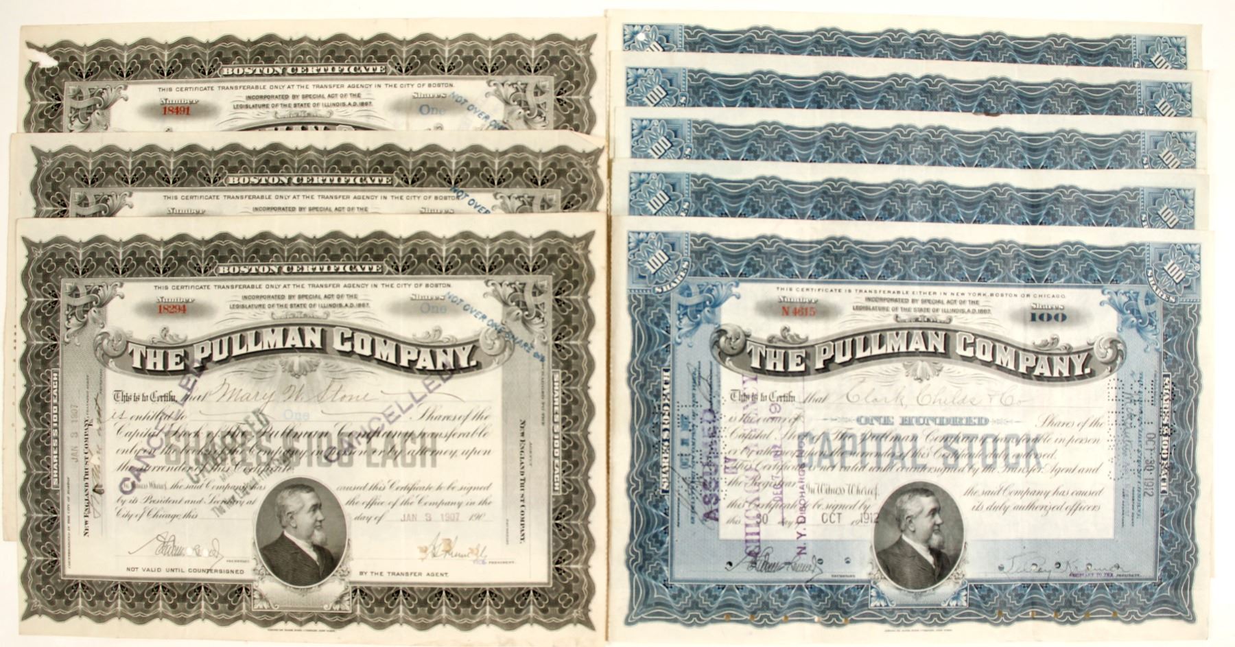9 total certificates. Three are grey trimmed, six are blue trimmed; all are signed and canceled by multiple presidents and secretaries, via hole punch. Vignette of Mr. Pullman (Bust), all in very good condition, some discoloration, some tearing. All incorporated in Illinois. . Ken Prag Collection