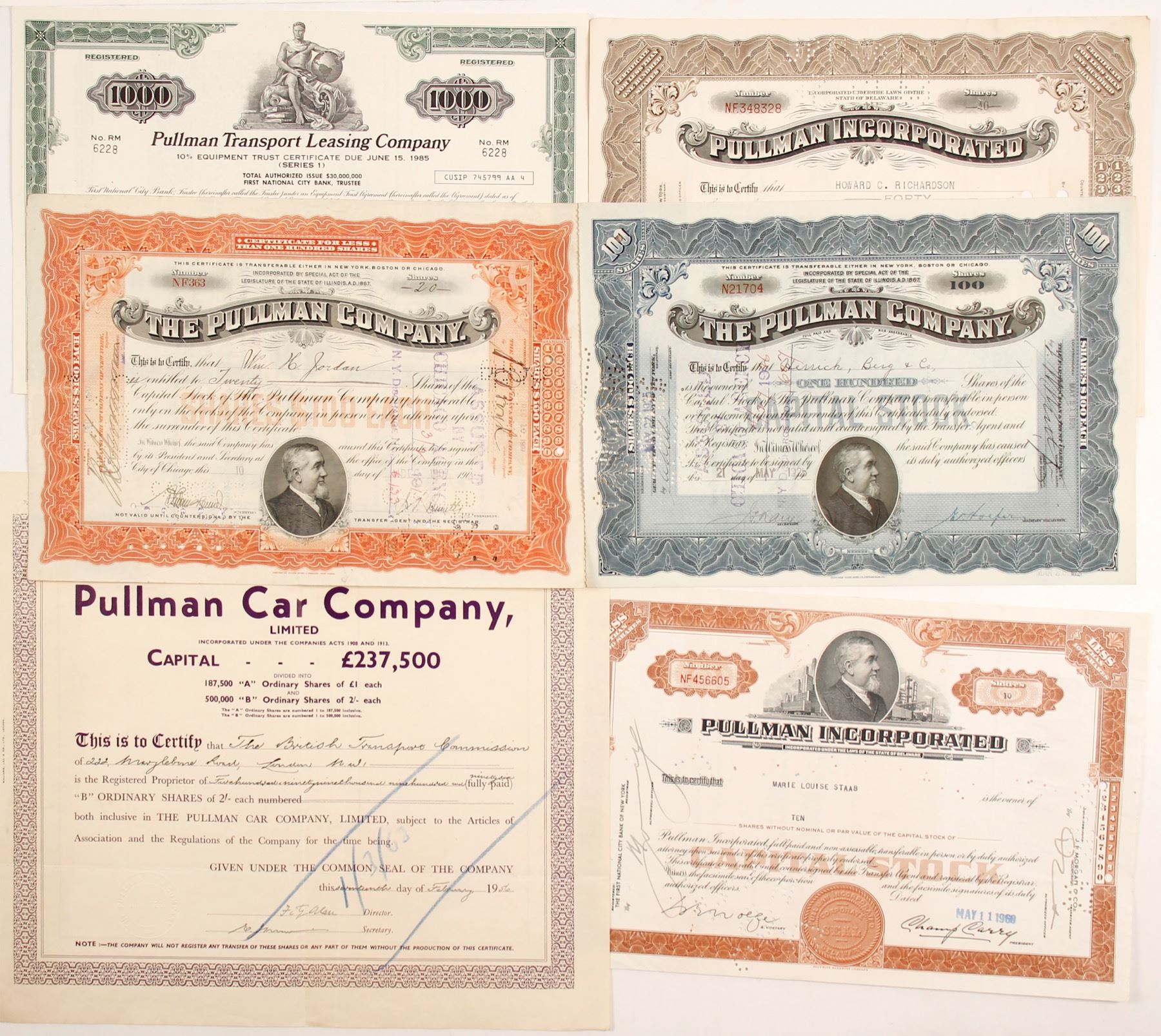 Pullman Transport Leasing 10% equipment trust Leasing 10% bond 1974 $1000. Stocks-brown #348328 1948, rust #363 1907, slate #21704 1925, tan #456605 1960. British stock #2044 599996 shares 1956. Prag Collection State: City: Date: HWAC# 84916