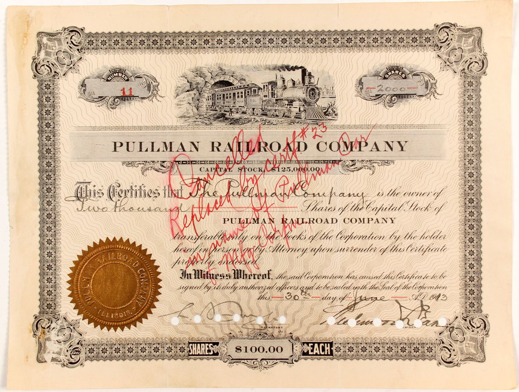 I/C #11 Pullman Co 2000 shares 1913 signed by President illegible. Left toning. .5' seam tear. Prag Collection. State: City: Date: 1913 HWAC# 84238