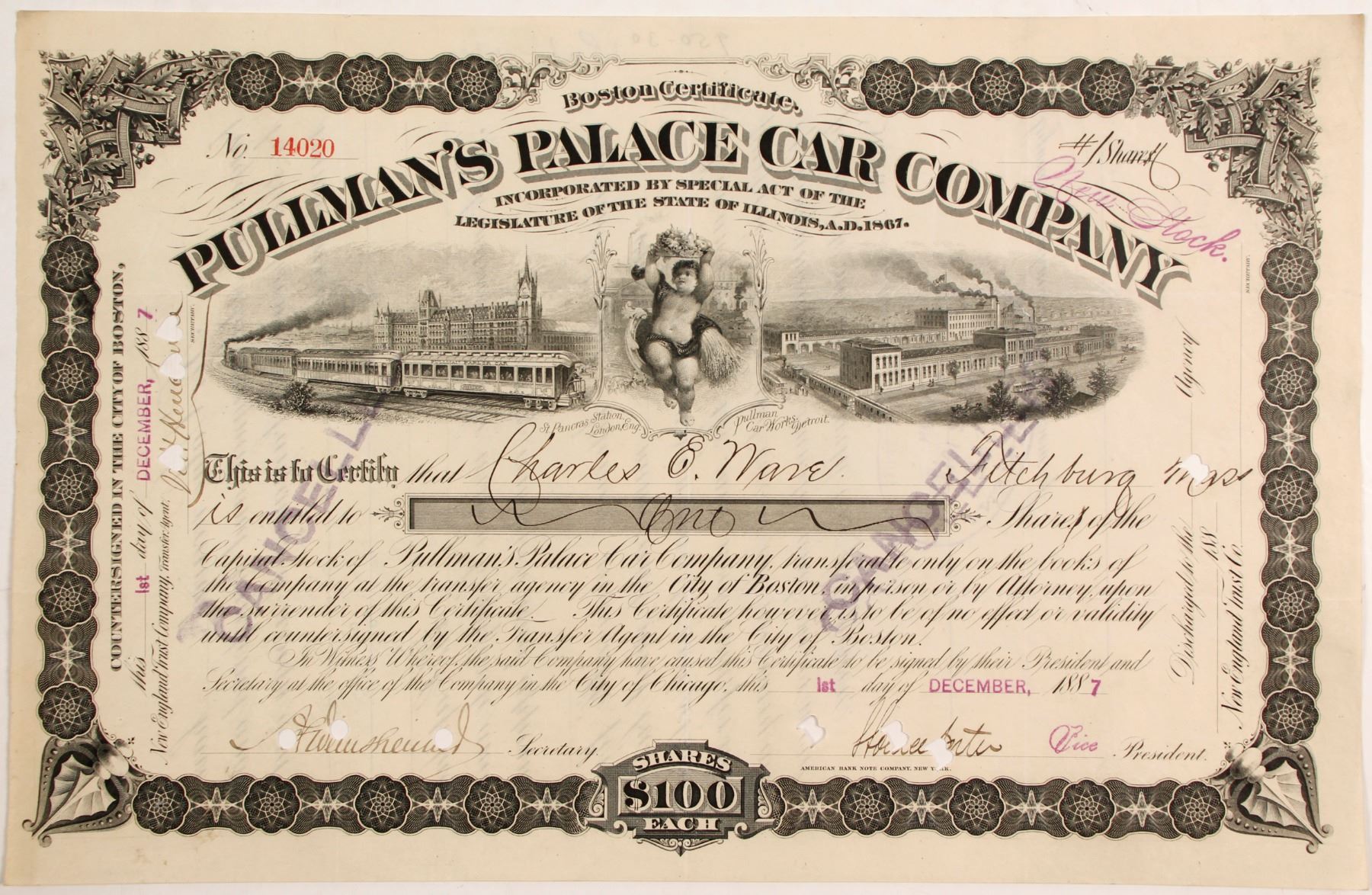 I/C #14020 Clarles Nare 1 share 1887. Signed by VP illegible. 3 vignettes train by old building, allegorical, factory. Prag Collection State: City: Date: 1887 HWAC# 84237