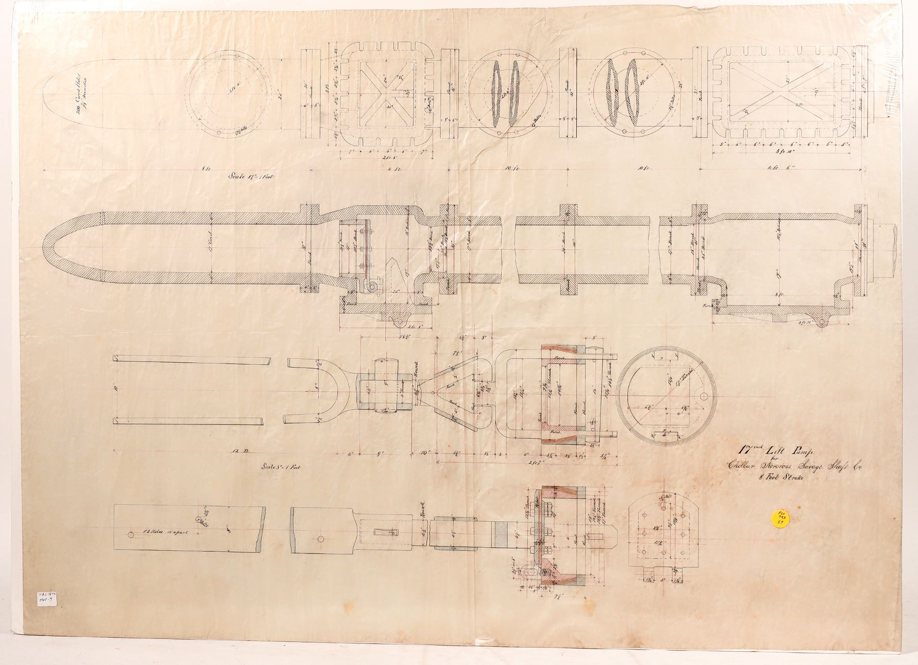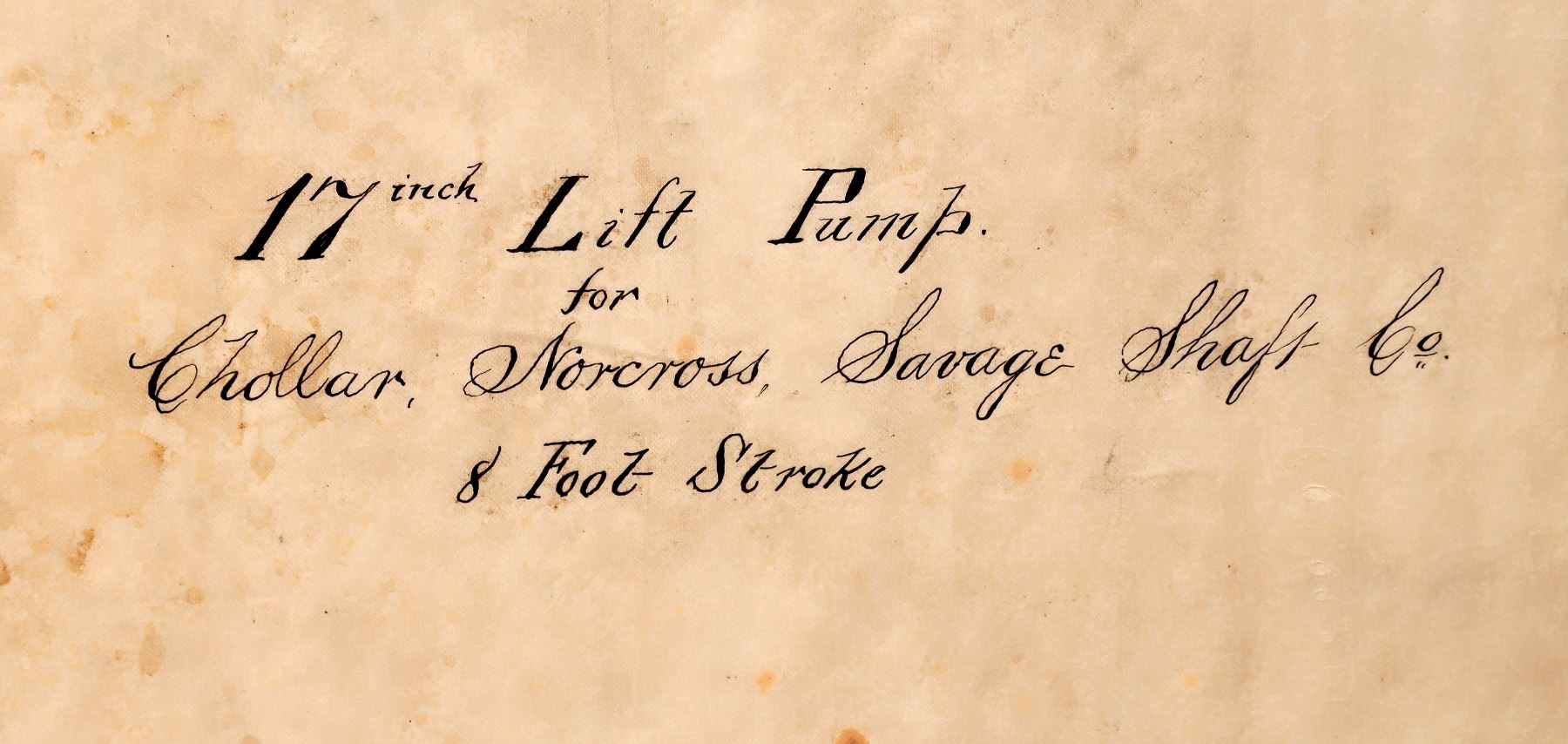 Original pen and ink on linen about 27 x 38" entitled "17" lift pump for chollar, norcross, savage shaft company; 8' stroke." Early diagram for a huge pump designed to get water out of the chollar shaft before the arrival of the sutro tunnel natural drained the chollar works. Nevada Franklin Collection