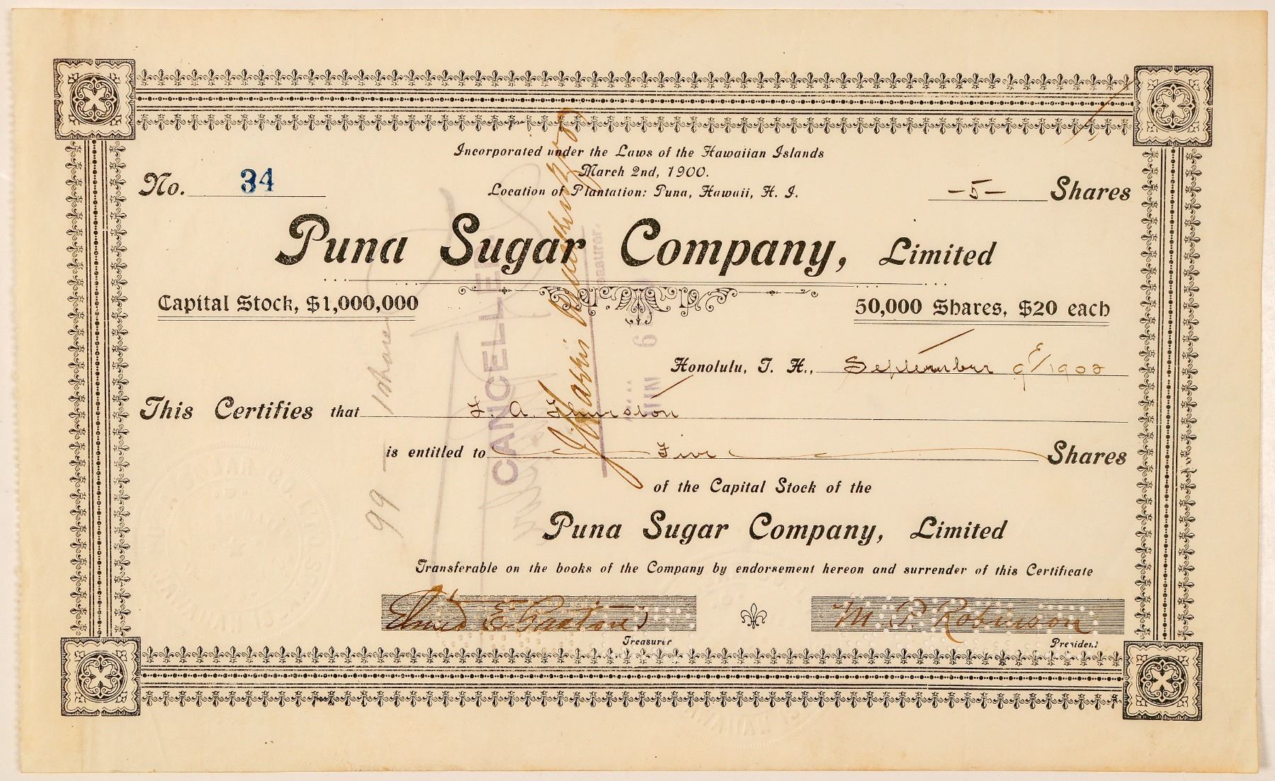 Inc. under the laws of the Hawaiian Islands, March 2nd, 1900. Location of Plantation: Puna, Hawaii, HT. No. 34, issued for five shares to LA Thurston on Sept. 9th, 1902 in Honolulu. Signed by president MP Robinson and the treasurer. Punch and stamp cancelled. Black border and print. Folds. 6.5 x 10.5" Incorporated with the Olaa Sugar Company, Ltd in 1899 by B.F. Dillingham, Lorrin A. Thurston, Alfred W. Carter, Samuel M. Damon, and Wm. H. Shipman. Thurston and MP Robinson (president of this company), also organized the Hilo Railroad Company in 1899. Ken Prag Collection