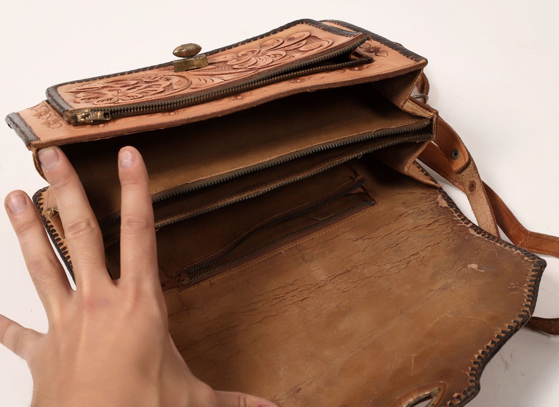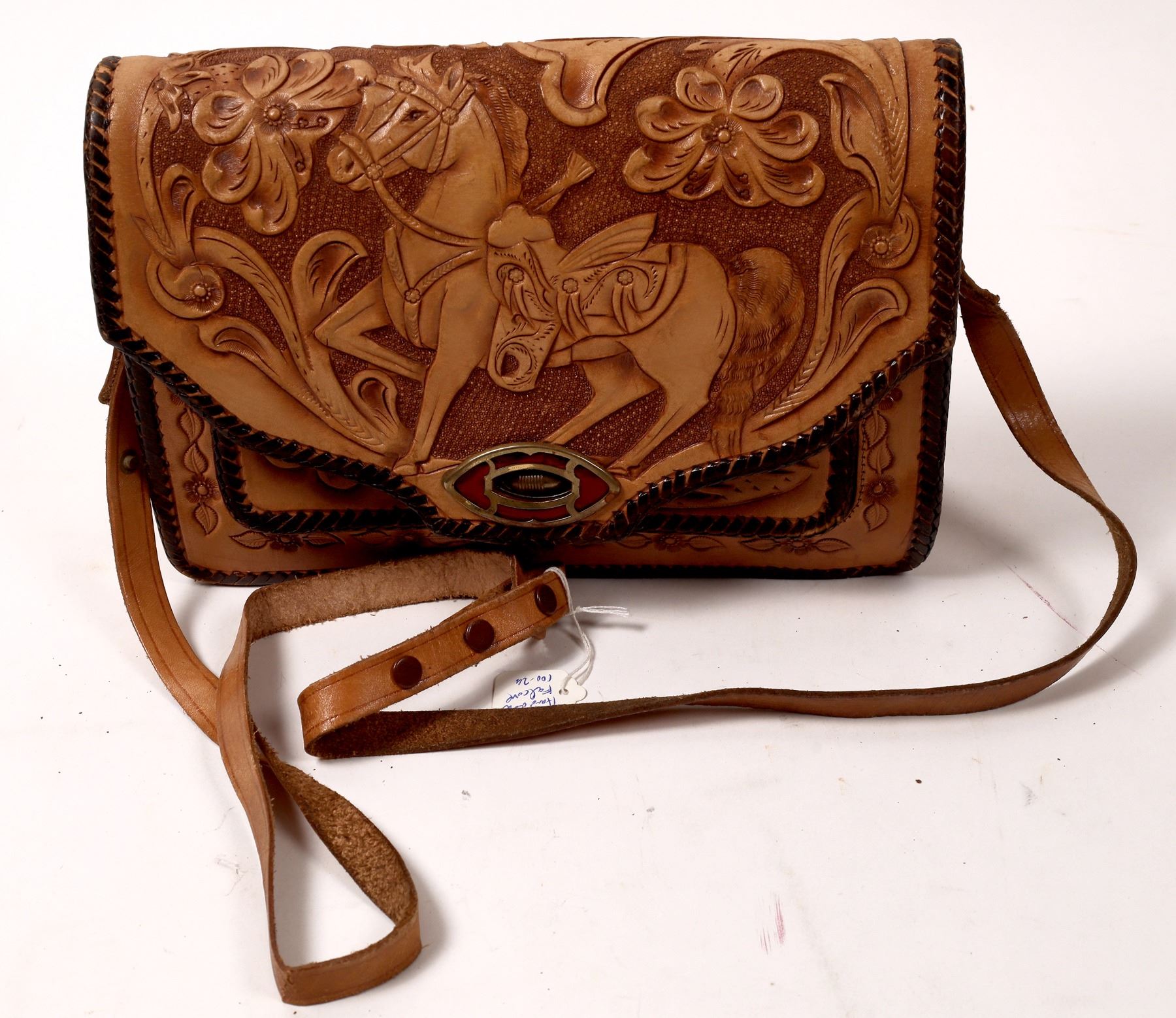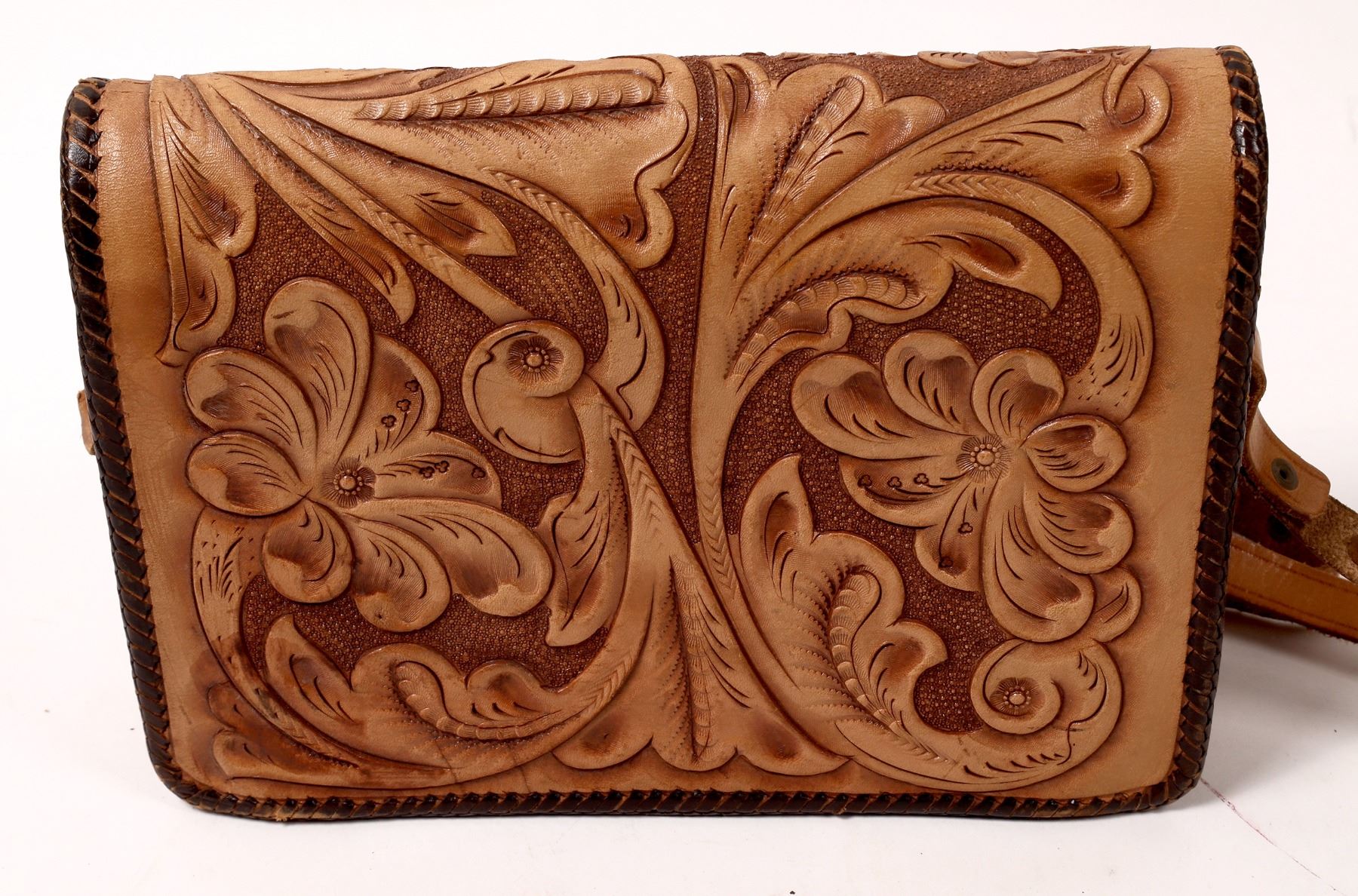 Western Style, Tan-colored, Leather Purse. Contains three main zippered pockets, along w/ two zippered sub-pockets. Appears like new, and comes with shoulder strap for carrying.