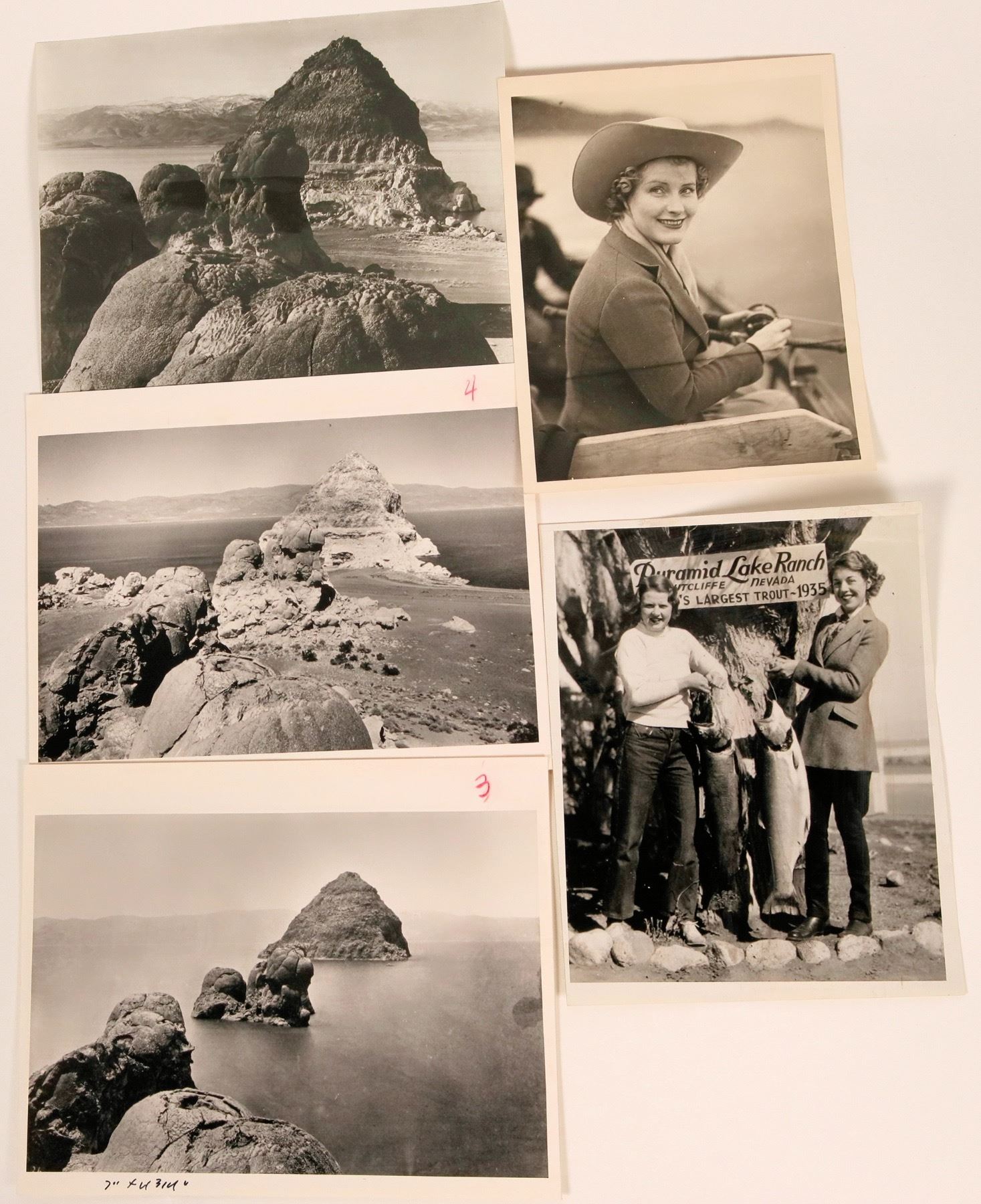 1) Set of 3 "Then & Now" 8x10" views, one from 1970 and two from 1984, all press photos; 2) Press photo of Catherine Dale Owens fishing at Pyramid Lake. 6.5 x 8.5"; 3) 1935 photo of two women holding up large fish at Pyramid Lake Ranch. 9 x 7"
