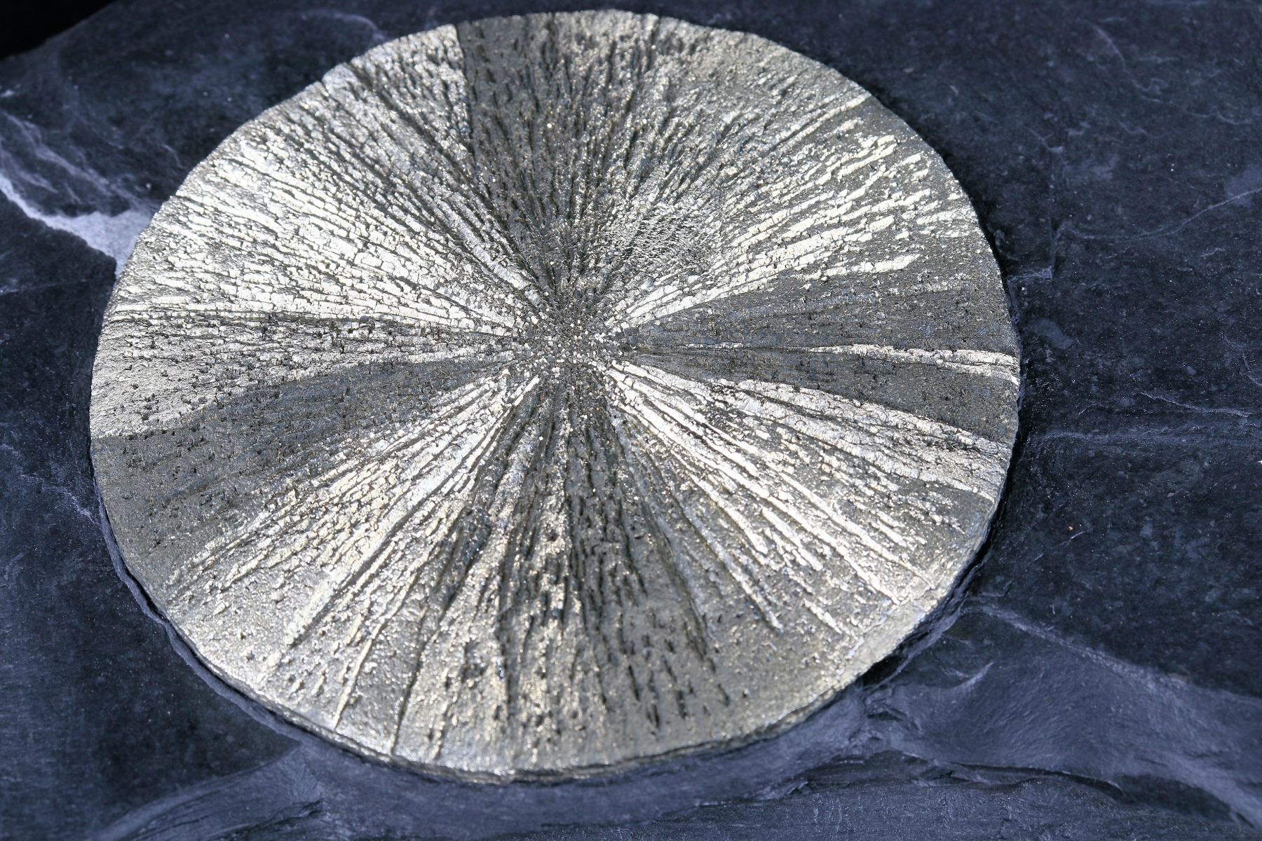 This Pyrite Sun is 3.5 inches in diameter on black slate 9.5 x 7 x 1.5 inches. Often called Marcasite Suns because the visible crystal form can appear to be orthorhombic, however, X-ray diffraction analysis of these suns shows that the composition is mostly pyrite, which is cubic. The two minerals are polymorphs, meaning that they have the same chemical makeup (FeS2) but different crystal structures. Marcasite has a nasty tendency to oxidize and crumble in collections, leading to the formation of free sulfur and sulfuric acid, which can then eat away at labels and boxes. Provenance: Chunlin Zhu Collection