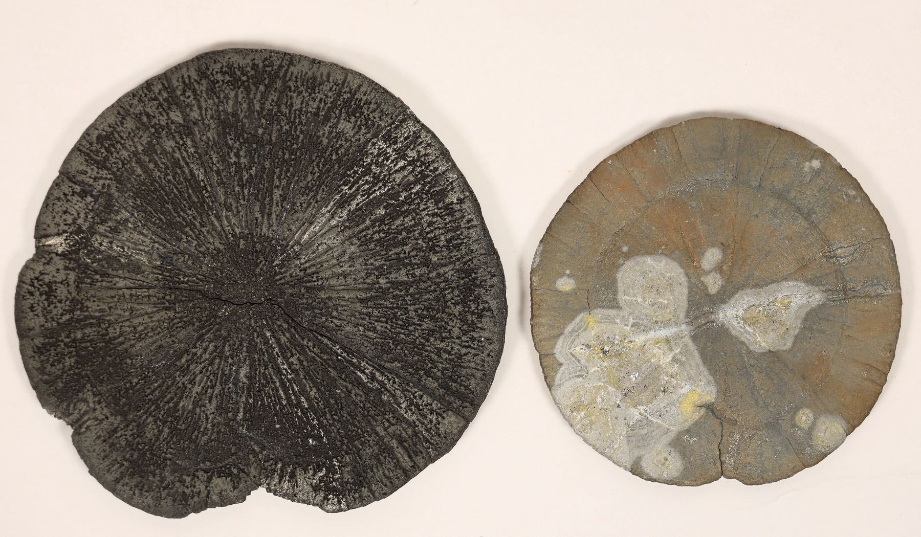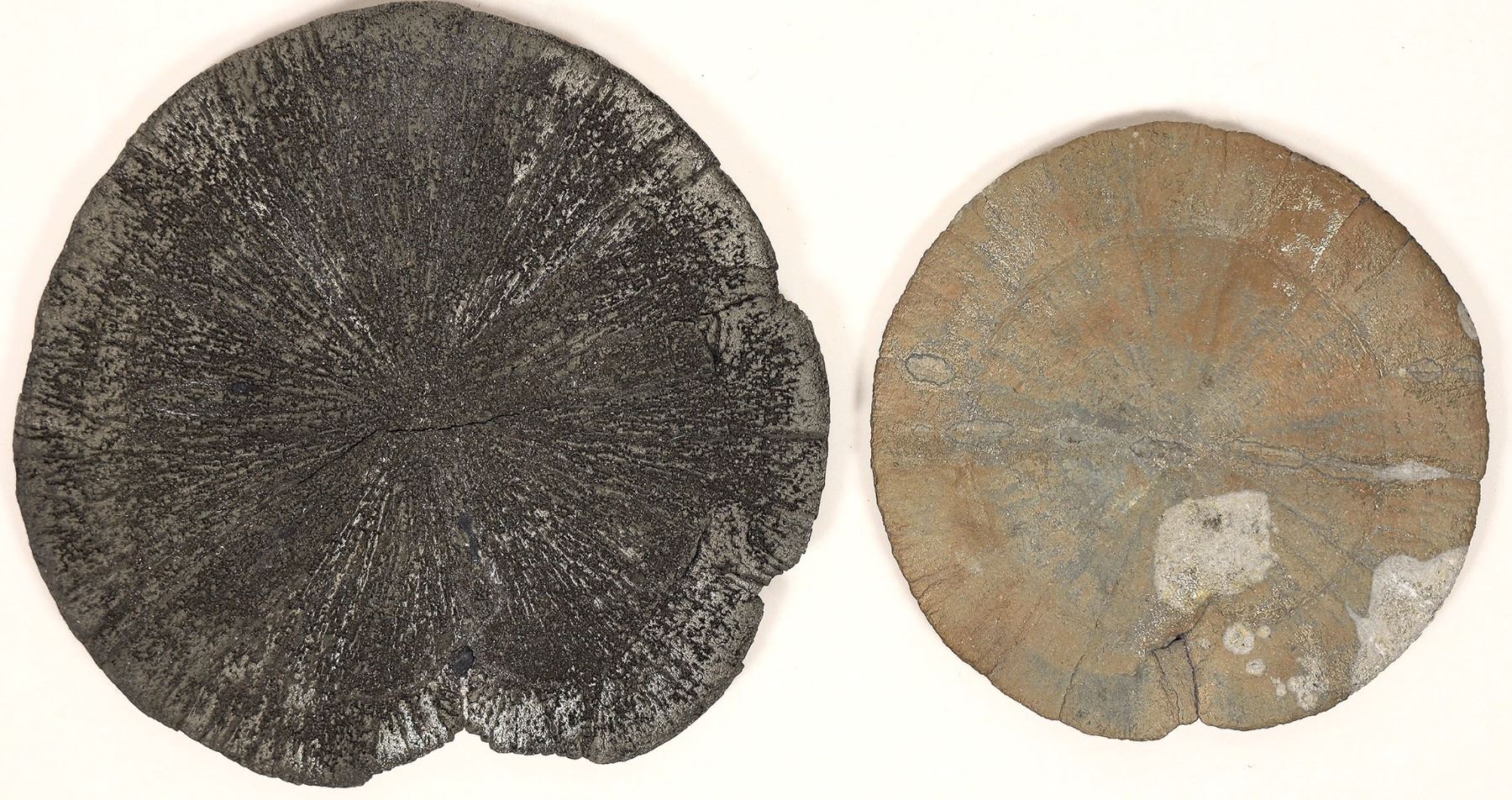 Pair of pyrite sand or sun dollars from Ohio. Pyrite sun dollars look like sand dollars but are not at all, and are actually much heavier. These approximate 3.5" and 2.5" diameter perfectly formed disks, also known as miner's dollars, are formations of pyrite found in coal mines. They are formed when the weight of overlying sediment causes pyrite crystals to grow laterally, resulting in flat concretions. Pyrite suns are found in Ohio, as well as in coal mines near Sparta, Illinois and in China. In Ohio, pyrite is found in black shales and coals from the Middle Devonian to Pennsylvanian periods.