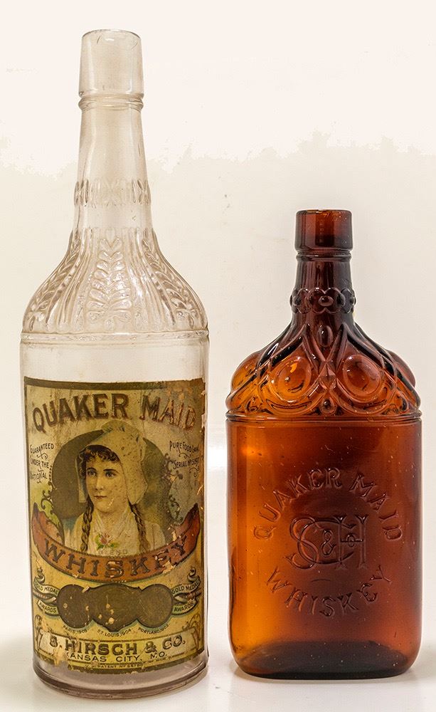 Quart clear whiskey bottle, embossed Quaker Maid Whiskey, with full face label on one side and base label on the other. A gorgeous example of this rare pairing. Also includes the more rare Quaker Maid whiskey embossed Amber pint flask with a lot of gingerbread on the shoulder and neck. Both bottles are tooled top, circa 1900 to 1910. HWAC# 46732 Date: 1900-1910 Location: