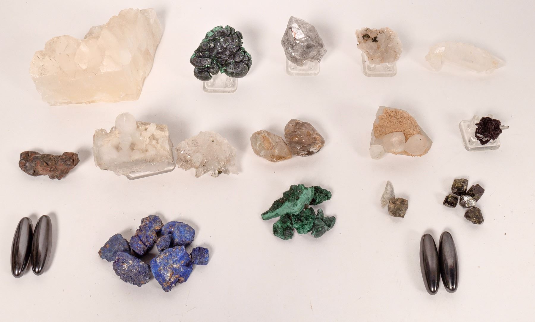 Large angular wedge of white rhombohedral calcite, 6 x 3 x 2.5"; seven pieces of rough azurite from 3/4" to 1.75" across, 179 gr; five pieces of malachite from 1" to 2.25" across, 70 gr; botryoidal malachite, 2.75 x 2.5"; cluster of clear quartz crystals 1/4" to 1/2" across on quartz matrix, 3 x 3 x 2.25"; cluster of clear quartz crystals with a few flecks of green epidote, 2.5 x 2.25"; finger-size, clear quartz crystals, 3.5 x 1.75"; two polished quartz pieces marked where bubble inclusions can be seen, each about 2 x 1.25"; single clear quartz crystal on which three rounded calcite crystals, each from 1/2" to 3/4" in diameter, have grown on a thin layer of tiny, tan dolomite crystals, whole piece is 2.75 x 2"; inter-grown pyrite crystal cubes, 0.75 x 0.75"; cluster of clear/white quartz crystals with a few dark green epidote crystals; clear quartz crystal with interior inclusions, one marked with a black circle, 2.75, 1.75"; small cluster of tabular black hematite crystals with a few small, clear quartz crystals, 1.25 x 1"; "Gobi Stone" chalcedony, 2.75 x 1"; five epidote crystals, each 1/2" to 3/4" across. Bonus: two pair of magnetite "rattlesnake eggs", a.k.a. "clackers." in gift boxes. Mineral localities unknown. China Chunlin Zhu Collection