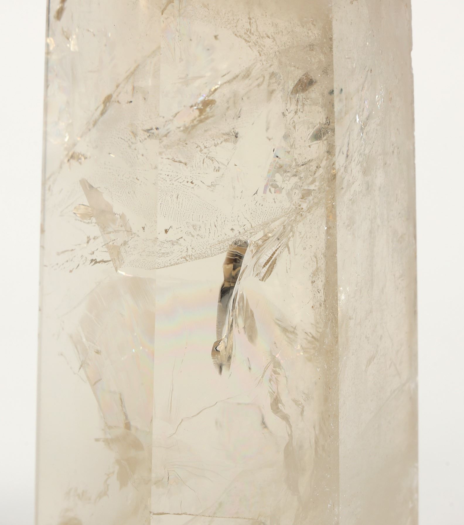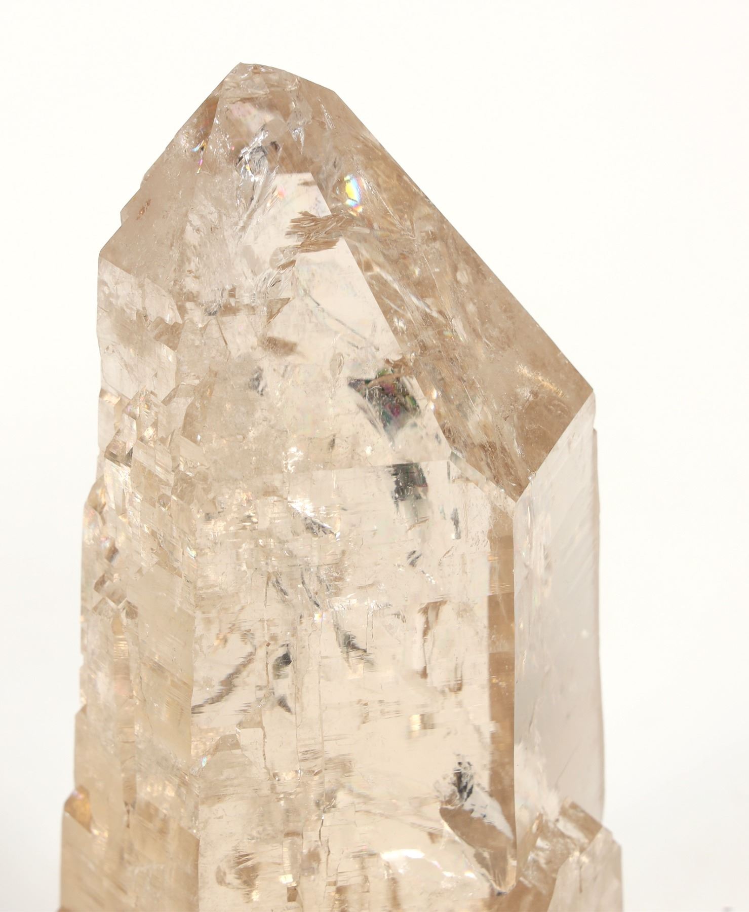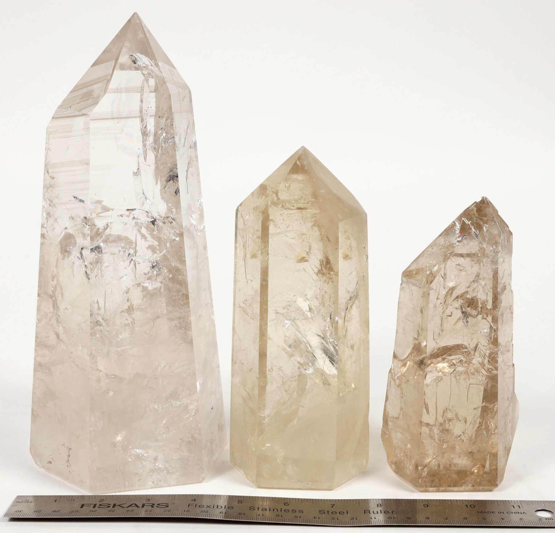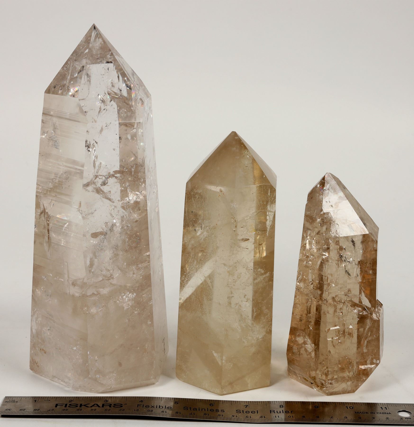 Quartz Crystal Points X-Large Trifecta. Massive, beautiful crystal points in crystal clear, pale yellow and smoky quartz (very pale). All are polished beautifully with glassy smooth facets. All have internal natural fractures/flaws and inclusions that create tons of sparkle and enhance visual appeal. The largest clear quartz point measures 10.5 inches tall and 4.5 inches wide at the base. many rainbows are visible inside the point. Absolutely stunning. The pale yellow quartz point measures 8 inches tall and 3 inches wide at the base. Two facets at the point are hazy. The inclusions and flaws are breathtaking and create mirrored plains, silvery slivers and even some rainbow effects. The smallest point measures 6.5 inches tall by 2.5 inches wide at the base and was broken from the matrix along one vertical face on the back side. That vertical face is not level, but it has been polished to eliminate sharp edges and at the bottom a small faceted hexagonal crystal growth is present. One other vertical face has a partial growth at the bottom as well, but none of these imperfections detract from the eye appeal of this piece, which also has mirror like flecks, planes and slivers inside, and eye catching silver, gold, rainbow and icicle/tinsel like visual effects inside the point. This is a STUNNING GROUP.