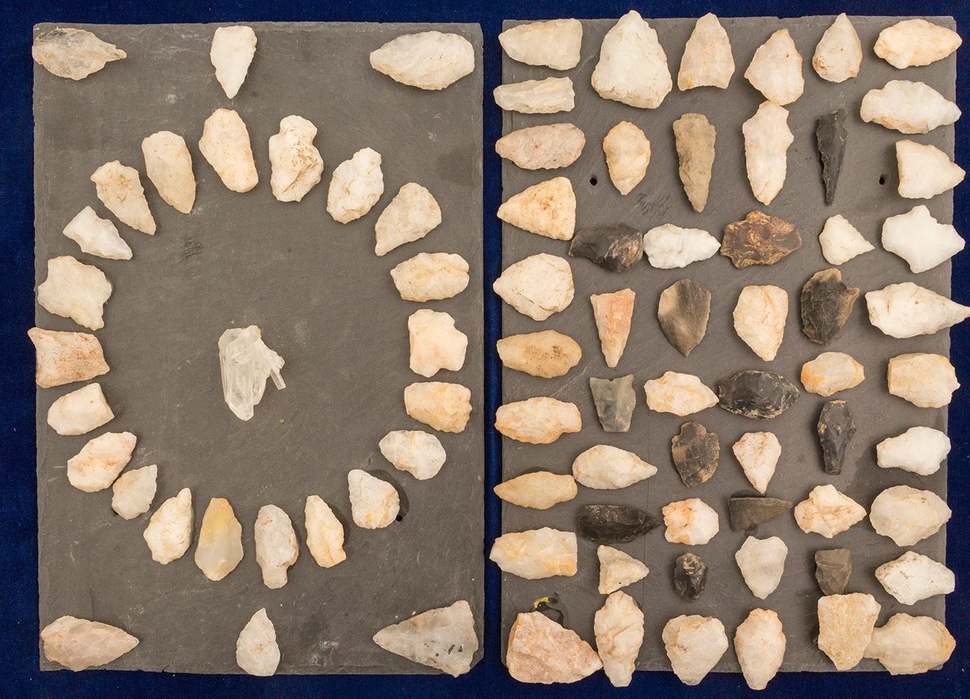 Bradley collection. Projectile points from the Chattahoochee River area at Roswell Georgia, collected c1940-50's. This collection of points is mostly quartz. Other points include obsidian and Flint. The collection numbers approximately 120 pieces, and includes some very crude projectile points. This lot takes on additional significance when we realize that America's first Gold Rush took place in Georgia in 1828 which displaced the Cherokee. The Cherokee sought hard rock to make projectile points. Quartz, one of the hardest minerals from the region, is found tin the metamorphic rocks of the Appalachian gold belt. There is no significant mineralization visible in the points, but it is notable that the quartz points probably came from the same geologic region as ultimately the gold did. These may have been traded with other groups along the way. Quartz points take on additional significance, as Native Americans were searching the local region for rocks hard enough to make sturdy projectile points for sustained use. Quartz, while hard, has no cleavage pattern, while flint or chert has a chonchoidal fracture pattern, easily conducive to the flaking process necessary for quality points. A very nice collection of historical importance. Date: Location: Georgia HWAC # 51062
