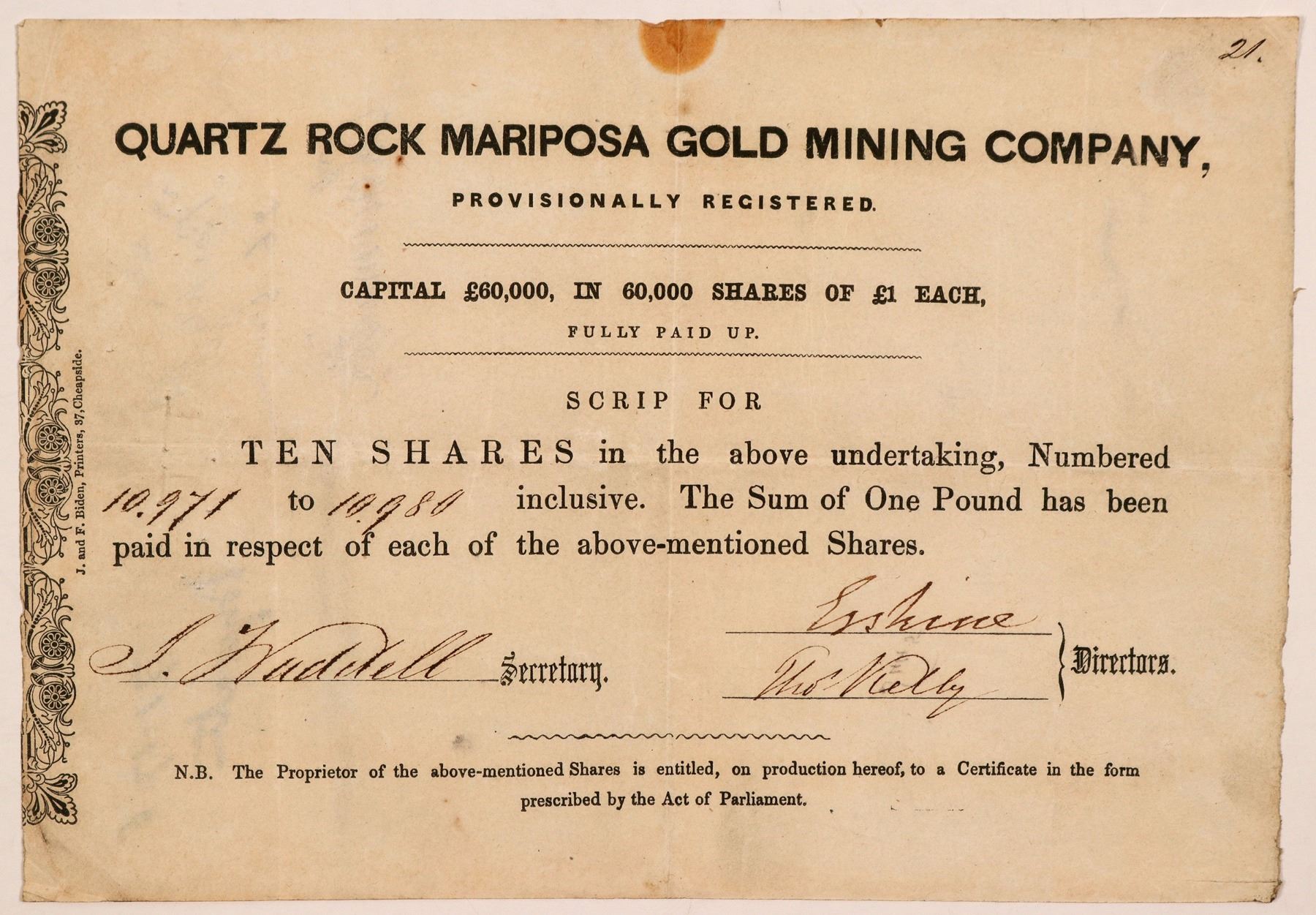 #21 in ink on top. Issued for ten shares (10971 to 10980). Signed by secretary J Waddell and directors Thomas Kelley and Erskine. Incorporated in London. "Fully paid up Scrip for one share." J. and F. Biden, Printers, 97, Cheapside. 6 x 8.75" Pinholes, folds, stains. This is one of the original Fremont-Hoffman companies. Lord Erskine secured the rights to work a 21 year lease. When the supt. arrived in California in 1852, Fremont's men refused to give him control of any land. He found a quicksilver claim nearby and then they took over the Mary Harrison and Virginia mines at Maxwell Creek near Coulterville, California in April 1853. The existing Mexican workers demanded a pay increase, but the company hired Chinese at a lower cost. They had Mexican, Chinese, French, German, English, and American employees. [See Money Pits, Woodland, pgs. 114-120 for a detailed history of the company] State: California City: Mariposa Date: c1852