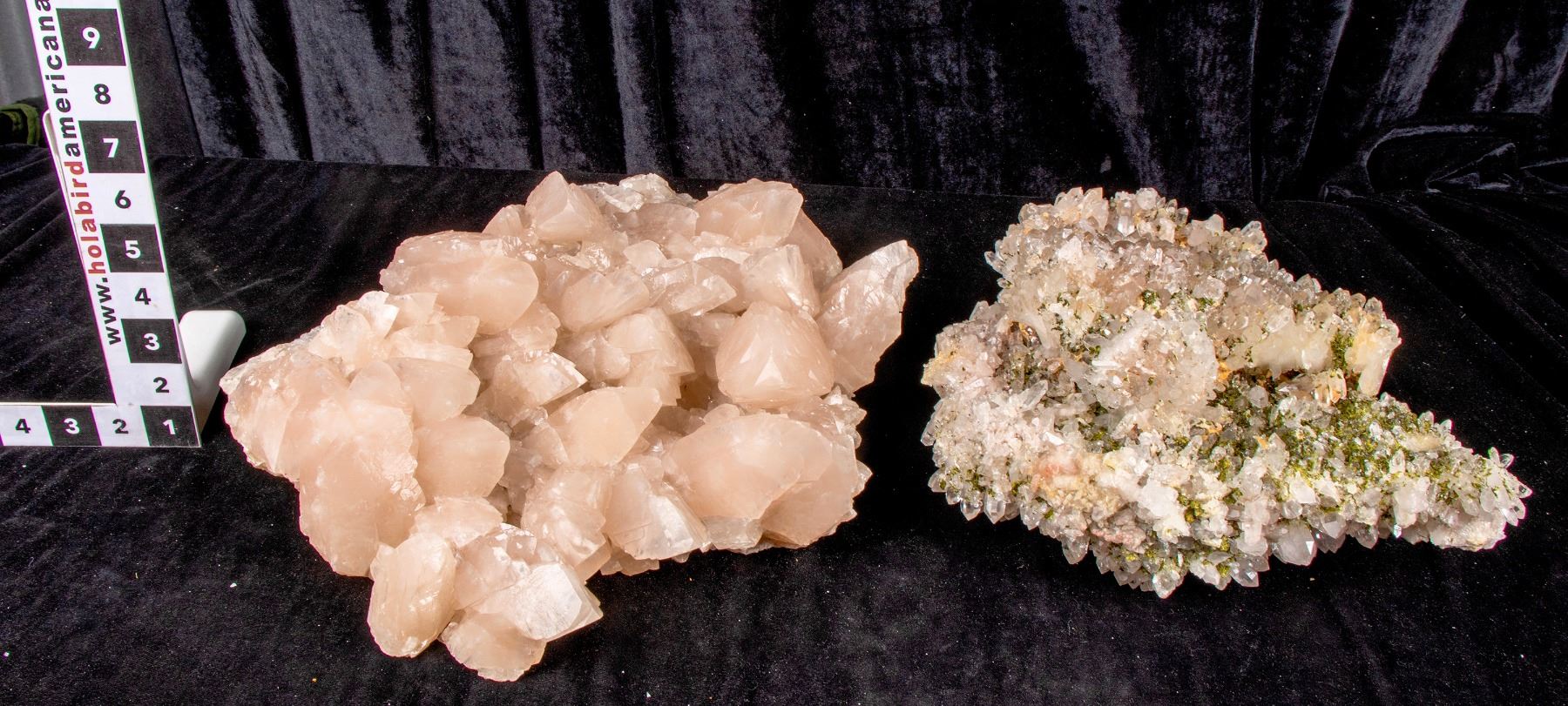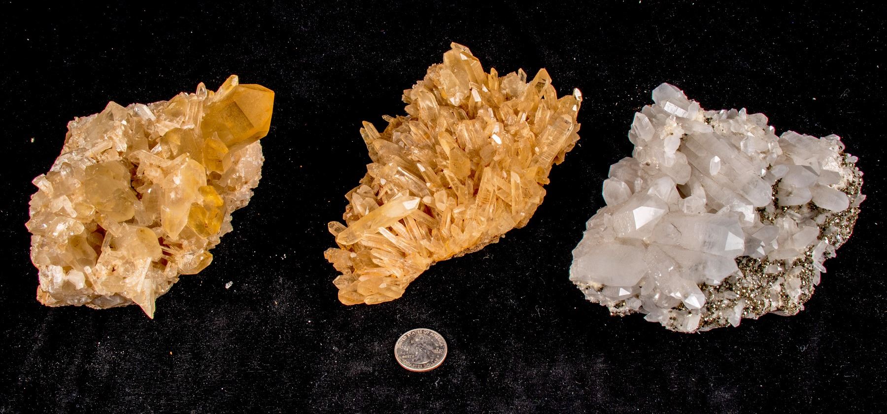 Yellow quartz clusters 5 x 4 x 4 and 7 x 4 x 1.5 and white quartz with pyrite 6 x 4 x 2.5 China Chunlin Zhu Collection