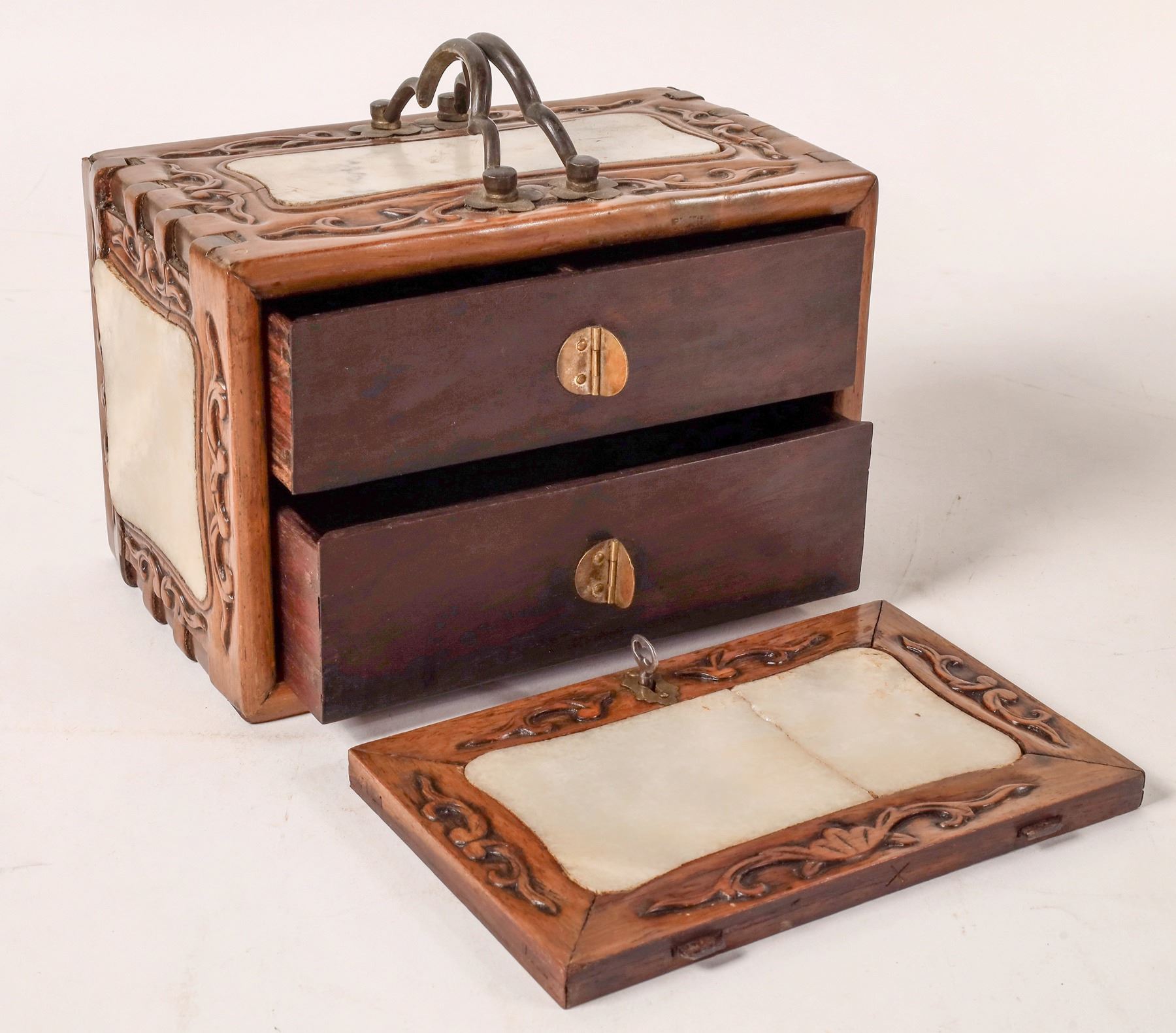 Nice 19th century carved wood box with 5 quartz side panels, 2 metal handles, lock and key. 2 internal storage drawers. 5.5x8.25x5".