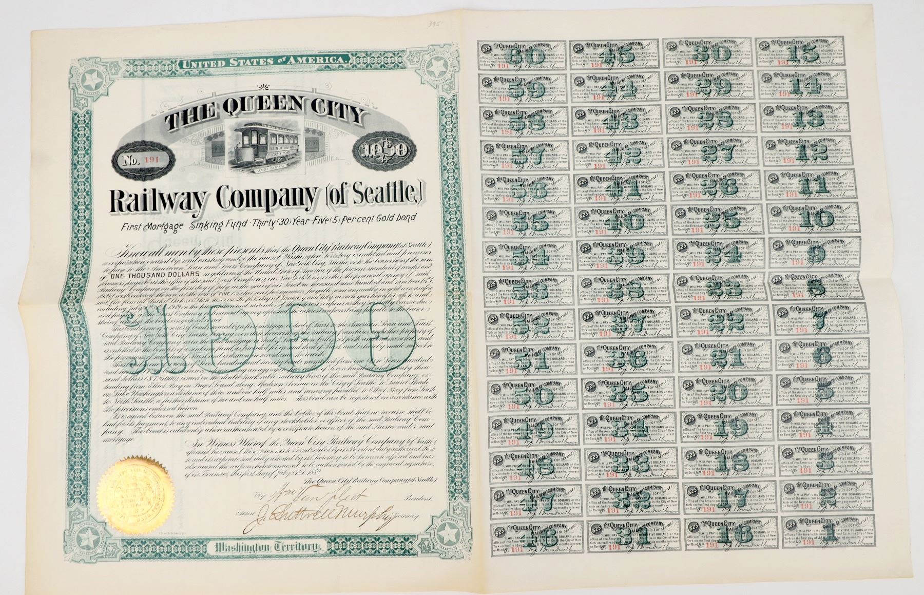 No. 191, issued for $1,000 in 1889. Signed by president William Van Fleet and secretary Murphy. Not cancelled. Green border, gold seal, black print, and vignette of streetcar for this company as part of the Terry System of streetcars. Full sheet of 60 coupons. 17 x 13"