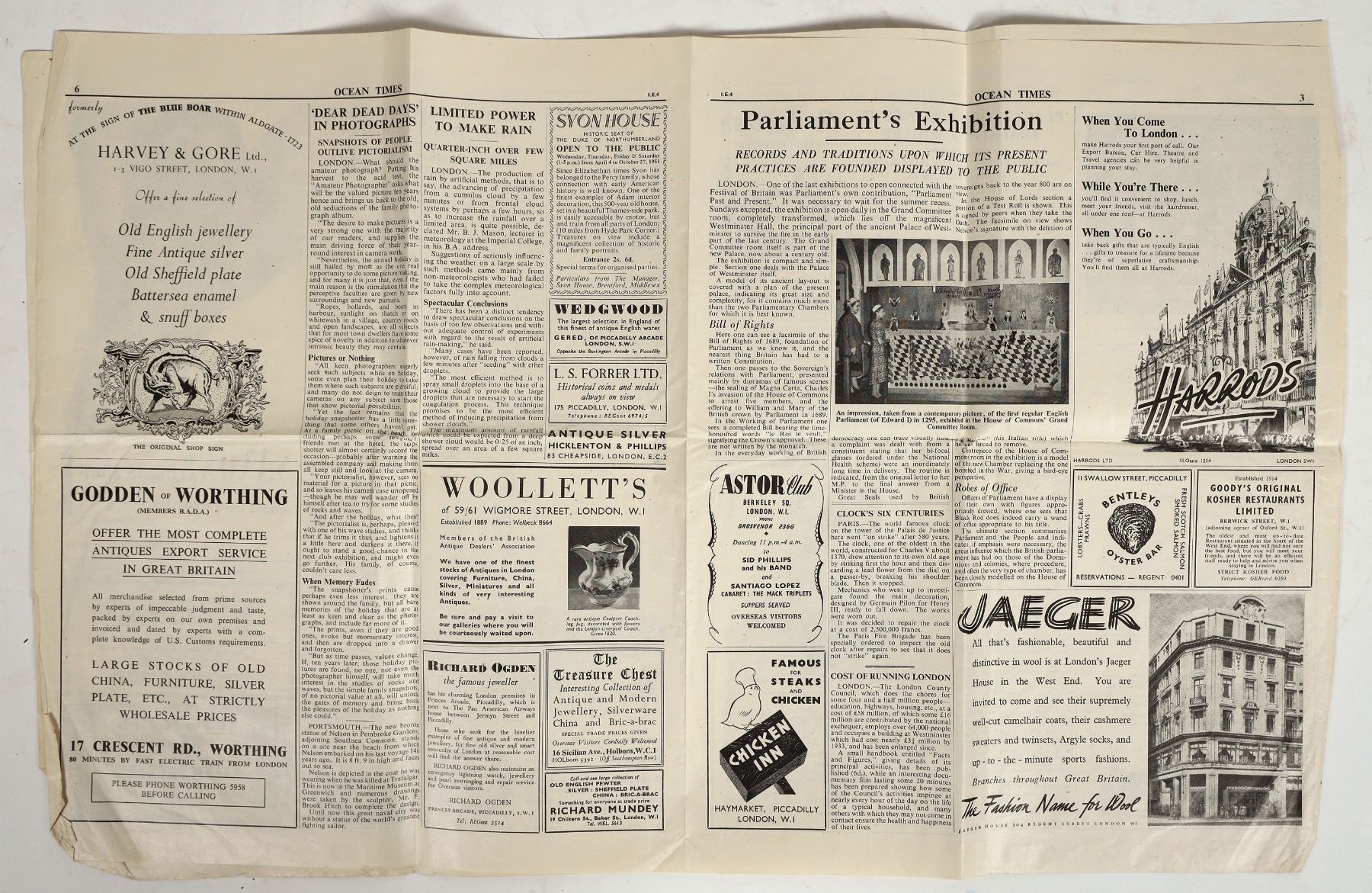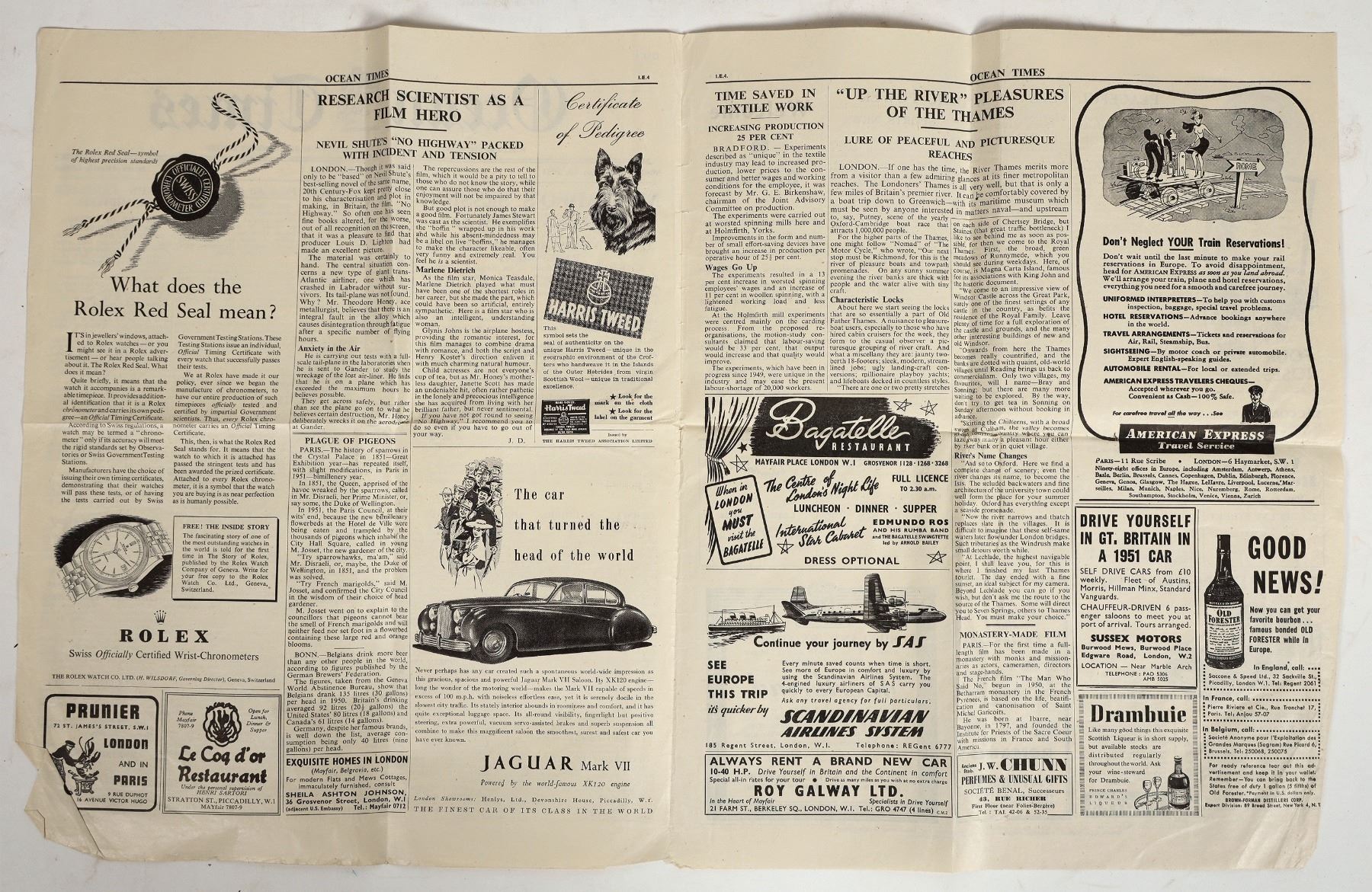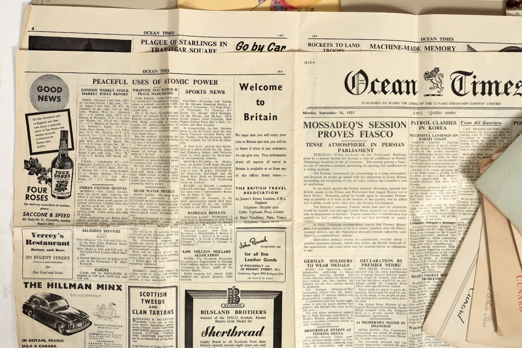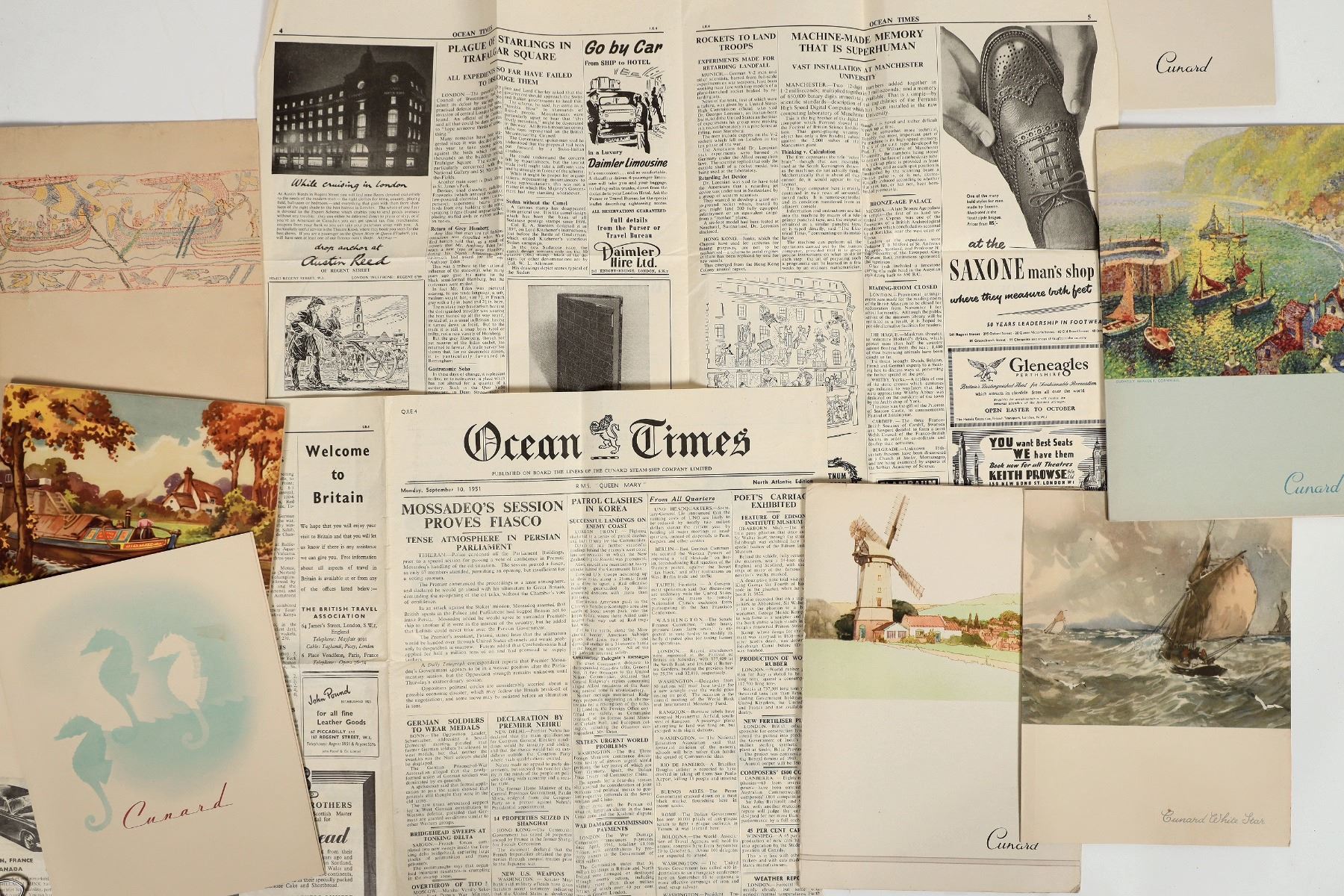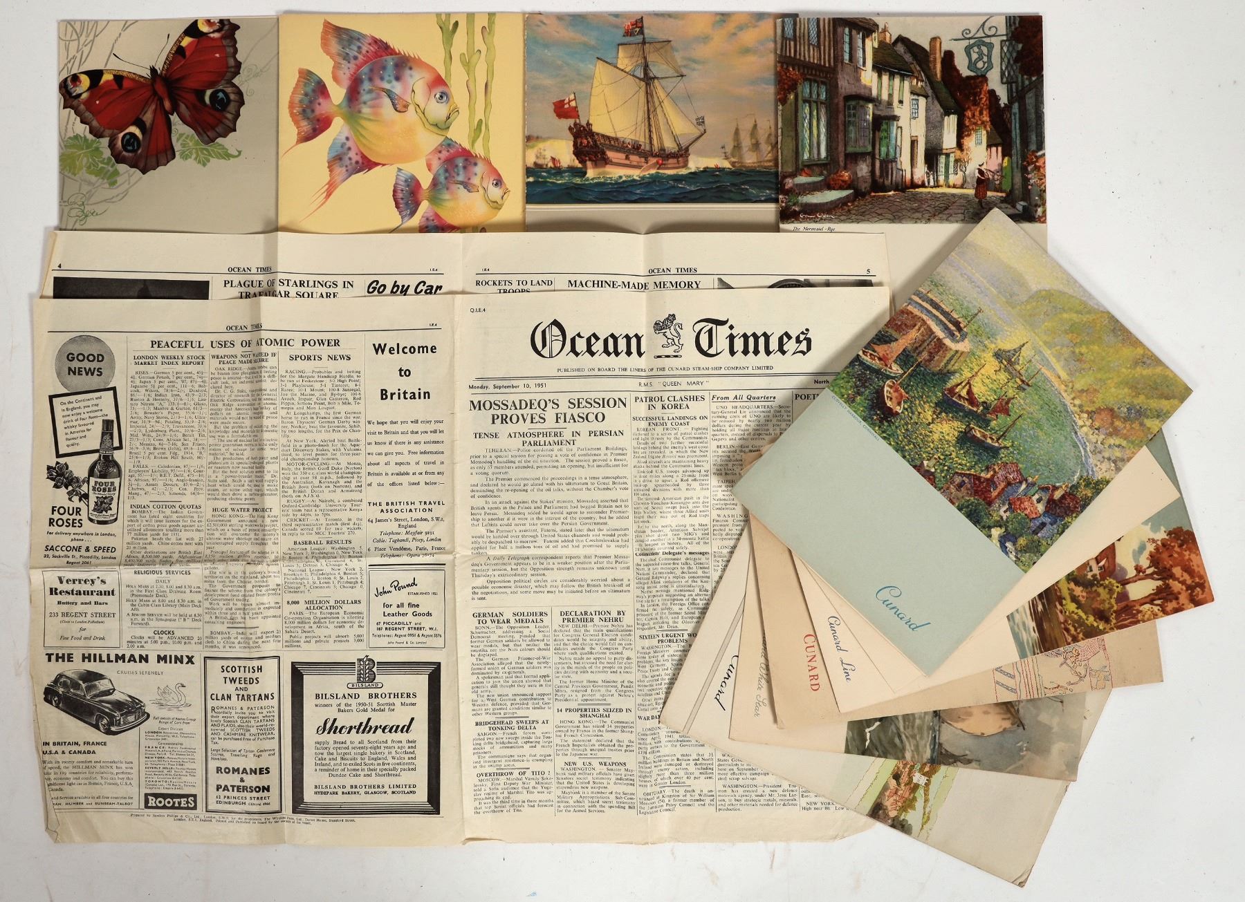 10 menus. Queen Mary, Cunard Lines, England. 1 Ocean Times Newspaper. Excellent Condition. Queen Mary permanently docked in Long Beach, CA as a Hotel/Restaurant today.