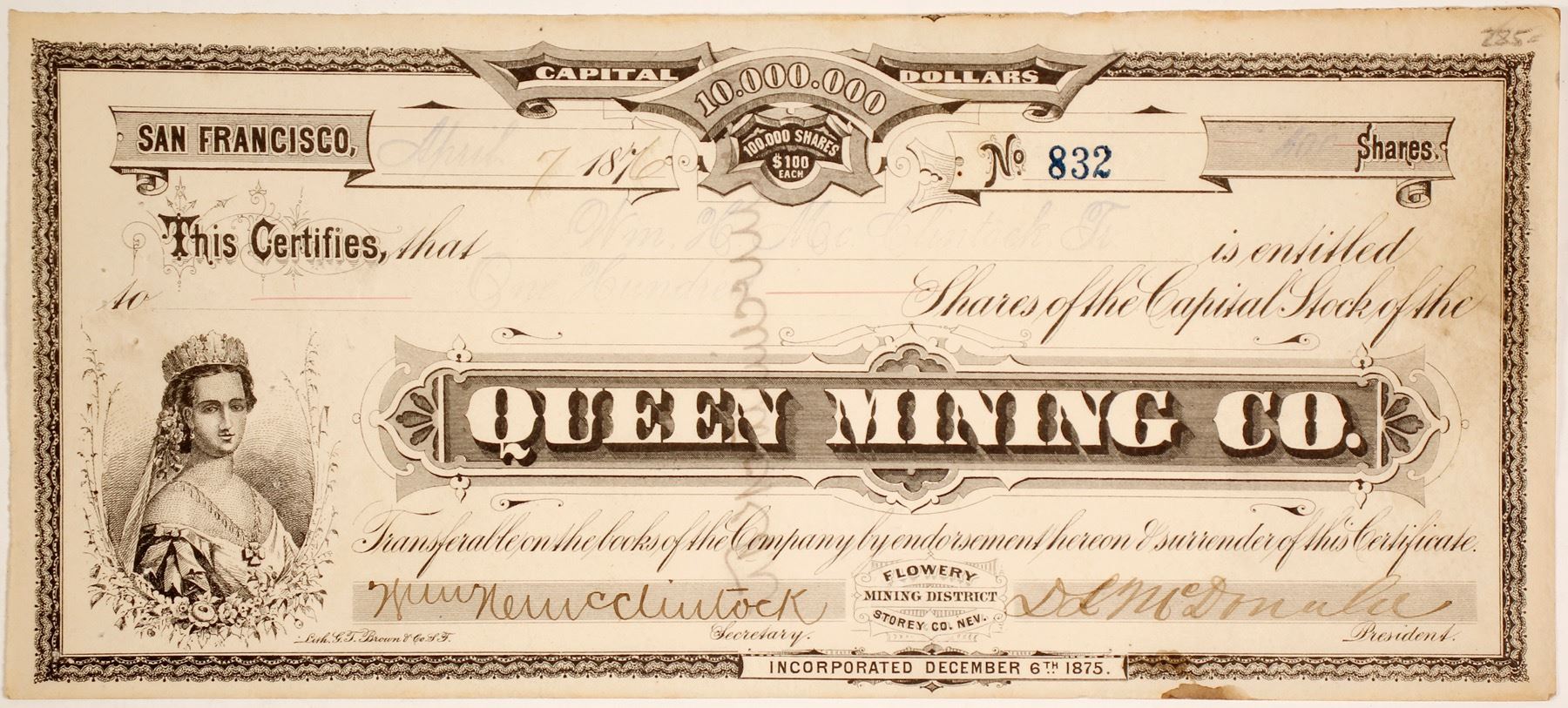 Location: Flowery District, Comstock Lode, Storey County. Nevada. Inc. Dec. 6th, 1875. No. 832, issued for 400 shares to William McClintock (company secretary) on April 7, 1876. Also signed by D.L. McDonald as President. Vignette of queen lower left. Lithograph by African American artist G.T. Brown. Pinholes and some ink stains. 4.25" x 9.25" ()