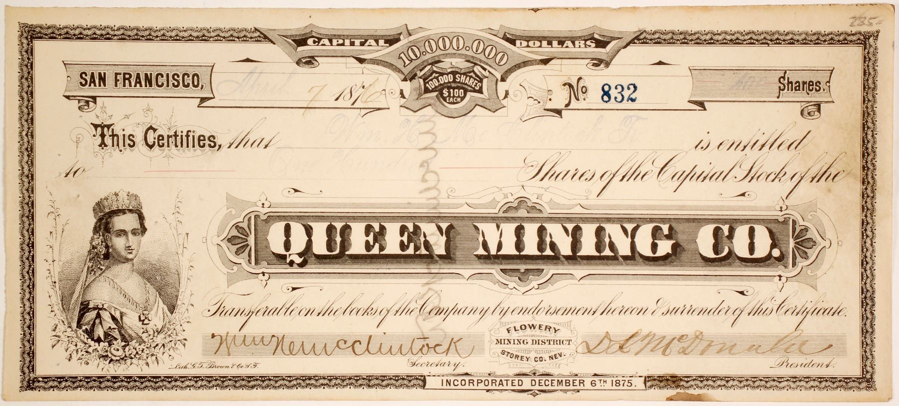 Location: Flowery District, Comstock Lode, Storey County. Nevada. Inc. Dec. 6th, 1875. No. 832, issued for 400 shares to William McClintock (company secretary) on April 7, 1876. Also signed by D.L. McDonald as President. Vignette of queen lower left. Lithograph by African American artist G.T. Brown. Pinholes and some ink stains. 4.25" x 9.25" (Prag Collection) City: Virginia City State: Nevada Date: 1876