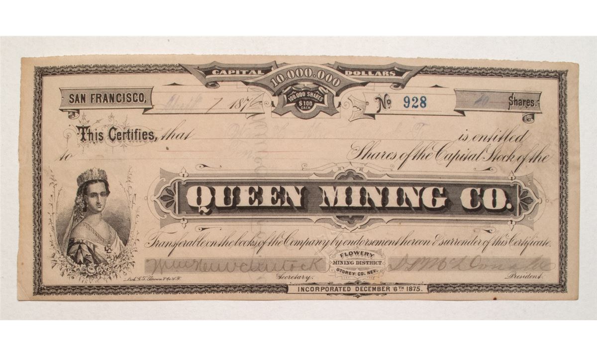 Queen Mining Co. Stock in Flowery Mining District in Storey County. Printed by G. T. Brown & Company. Brown was an early African American printer in San Francisco. Signed by Thomas Cole and E. Hall.