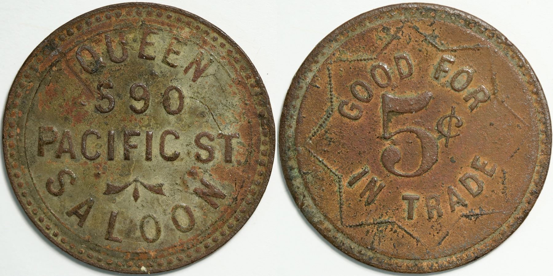 Obv.: Queen / 590 / Pacific St / Saloon; Rev.: Good For / 5c / In Trade. Rd., br., 25 mm. Unlisted in Kappan. 584-590 Pacific Ave., originally built in 1907 as a Barbary Coast Saloon, named “The Queen”, is a historically significant Brick and Timber building in the Jackson Square district of historic San Francisco.