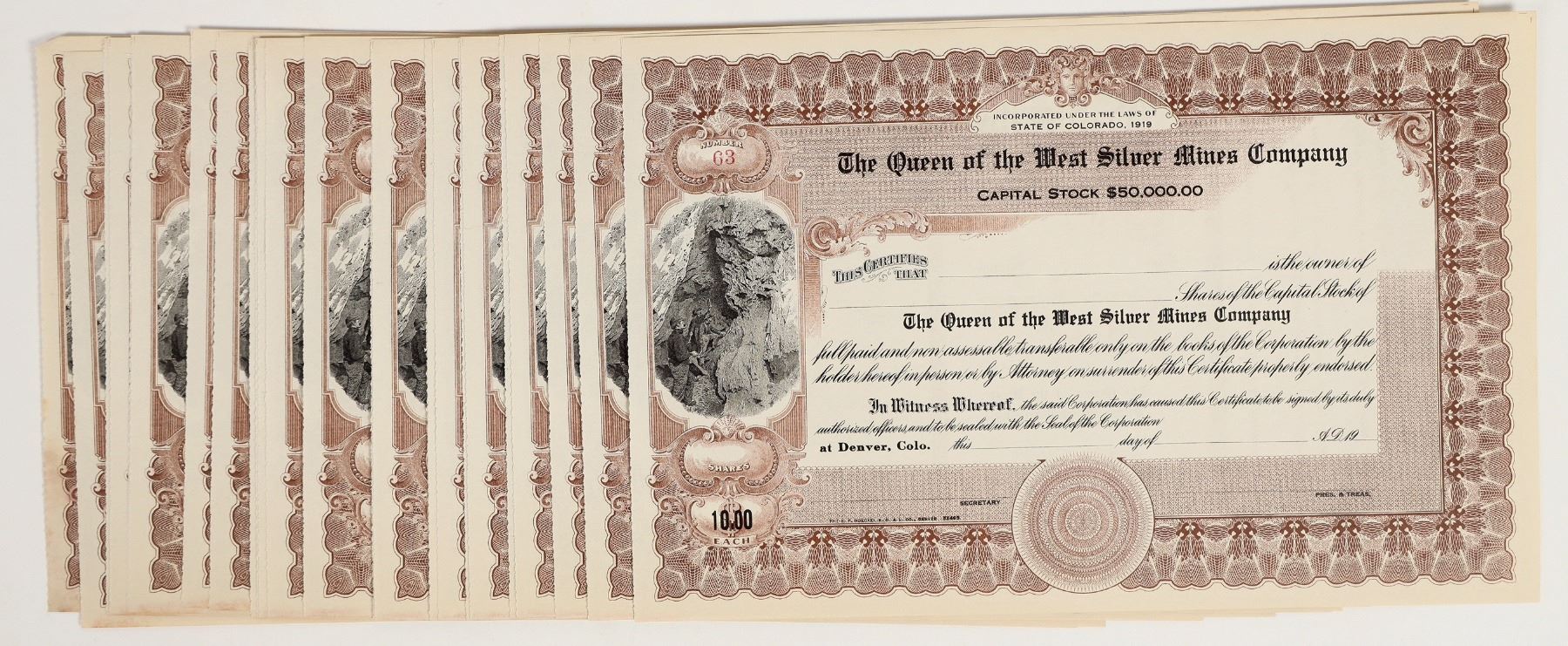 About 25 Queen of the West Silver Mines Company Stocks. Summit County. Ten Mile District. Unissued. Unusual mining vignette.