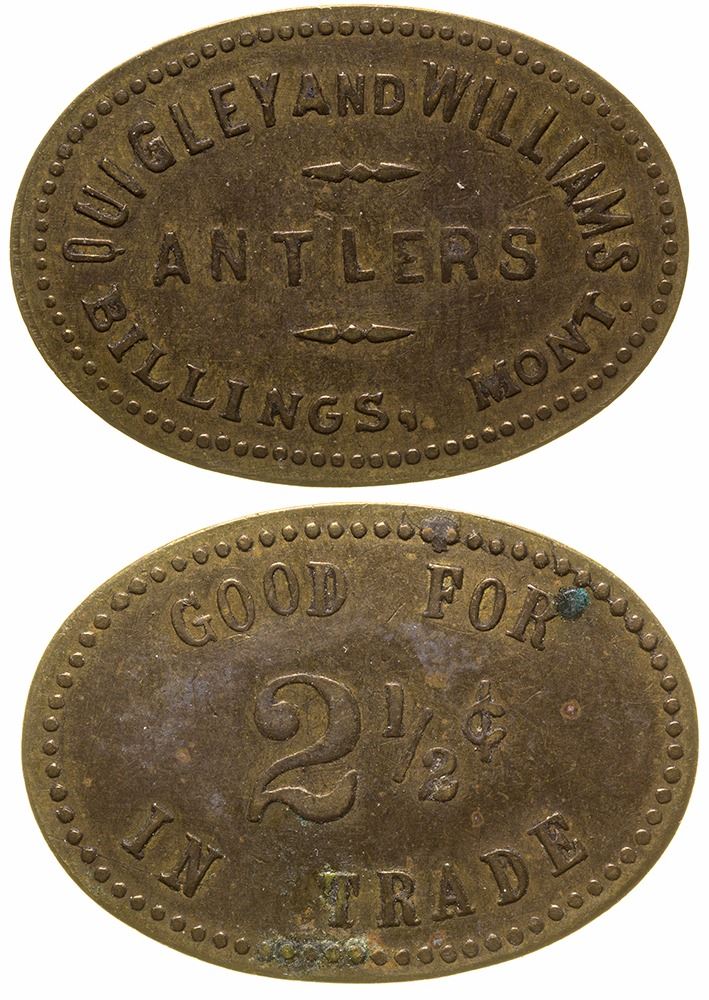 Quigley and Williams / Antlers / Billings, Mont. // GF / 2-1/2c / IT. Oval, brass, 30mm. State: Montana City: Billings Date: FHWAC#: 41549