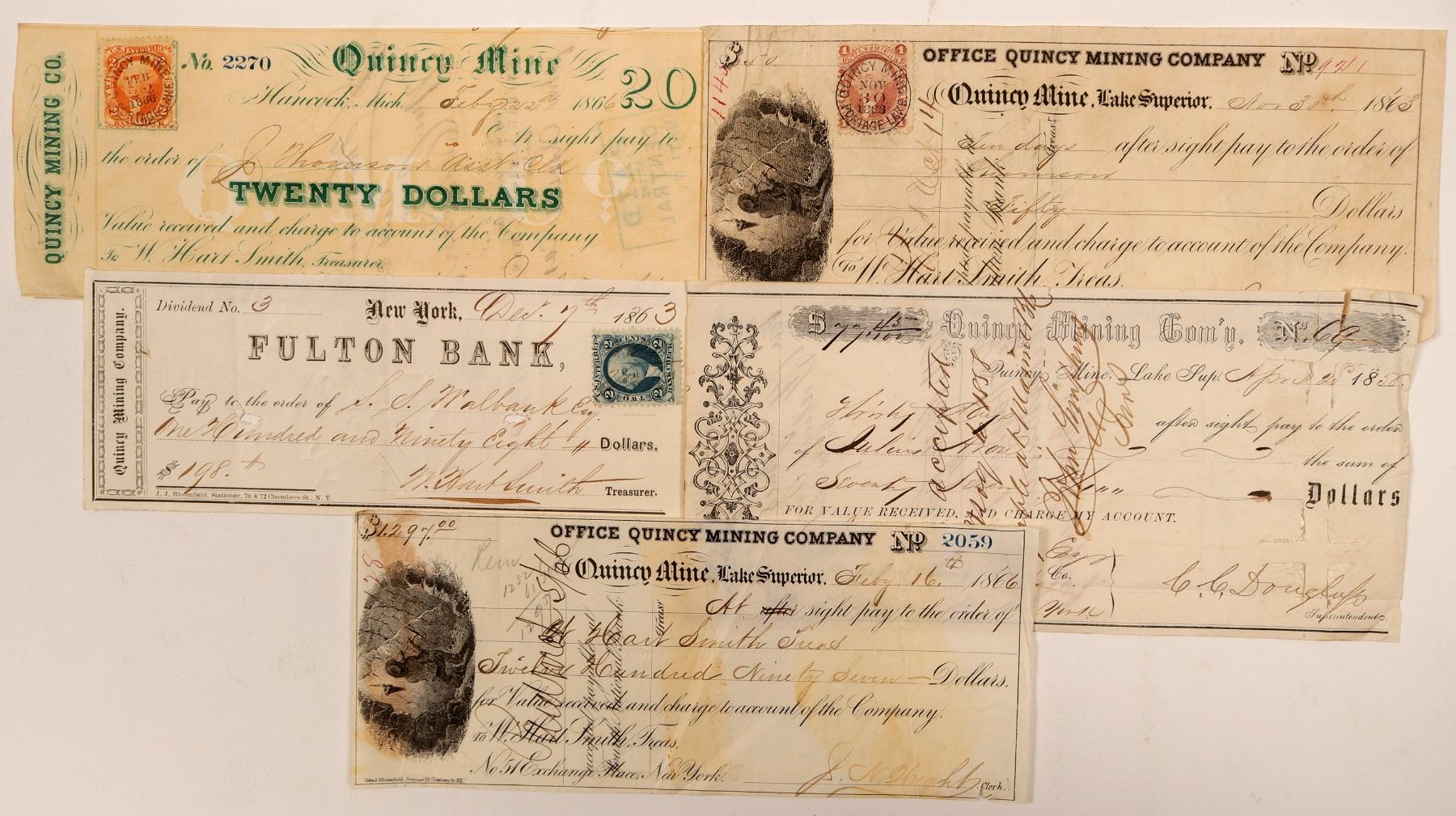 5 Quincy Mine checks 1852-1866, 2 pictorial. 1 with corner tear. Houghton Estate Collection