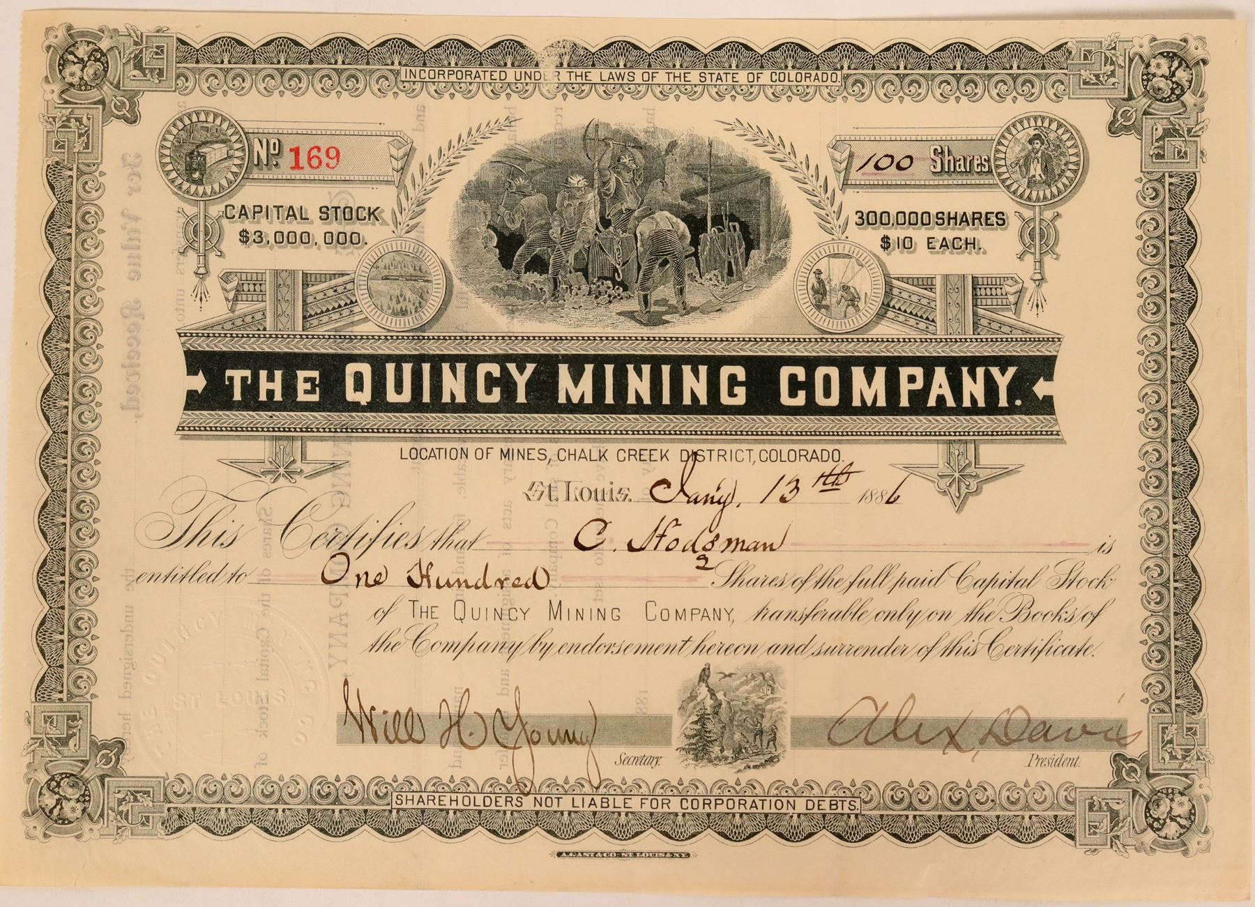 Cert. #169, issued to C. Hodsman for 100 shares and signed by Alex Davis as president and Will H. Young as secretary. Location of mines: Chalk Creek District, Colorado, printed on the masthead. The Quincy mine was located in 1876 on Chrysolite Mountain, 6 miles from Alpine. A silver mine, it assayed at 75 to 340 ou. silver per ton. The company had one forty foot shaft (Colorado Directory of Mines, Corbett, 1879). We don't believe that we have seen this one before. Nice mining vignette. Agast & Co. St. Louis & N.Y. printer. VF. Uncancelled.