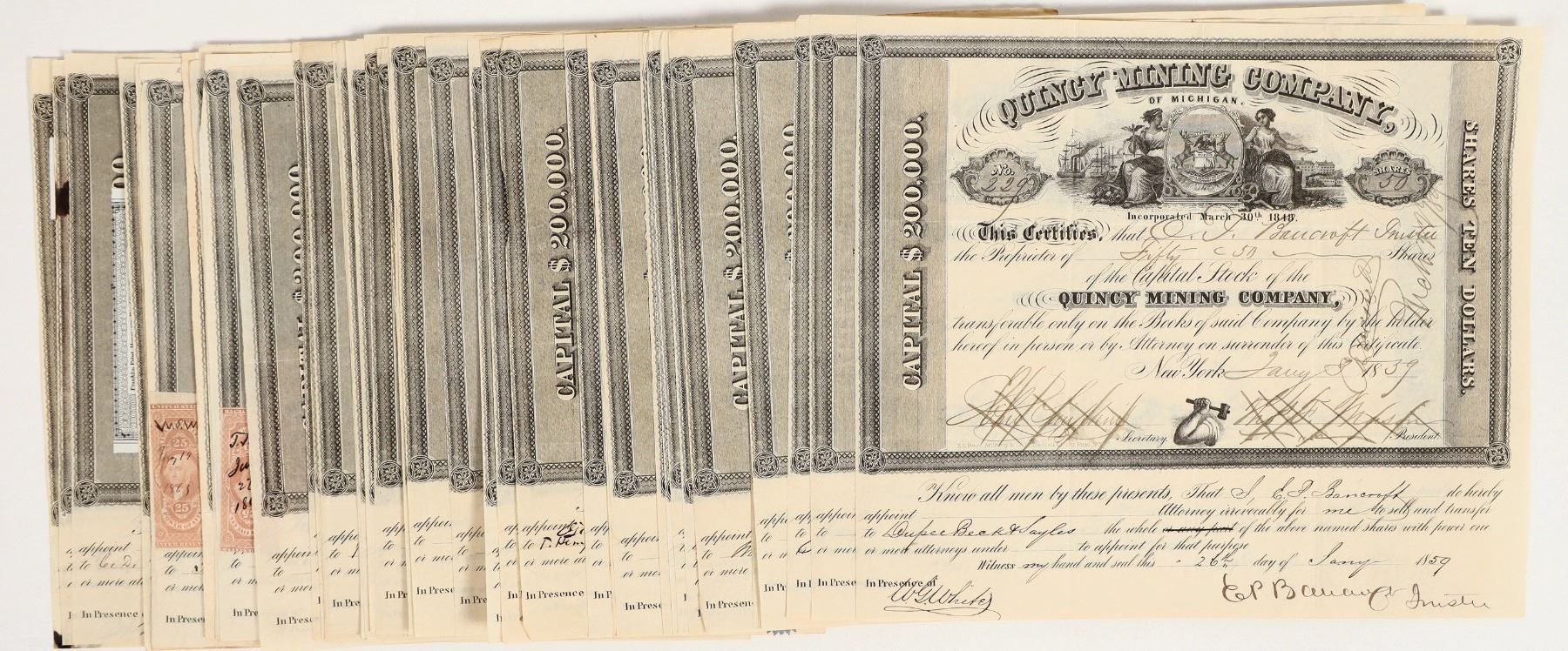 69 Quincy Mining Company of Michigan Stocks c.1839-1863, mostly 1859. Many signatures, and stamps. Nice early stocks. Rare. The Quincy Mine is an extensive set of copper mines located near Hancock, Michigan. The mine was owned by the Quincy Mining Company and operated between 1846 and 1945, although some activities continued through the 1970s. The Quincy Mine was known as "Old Reliable," as the Quincy Mine Company paid a dividend to investors every year from 1868 through 1920.
