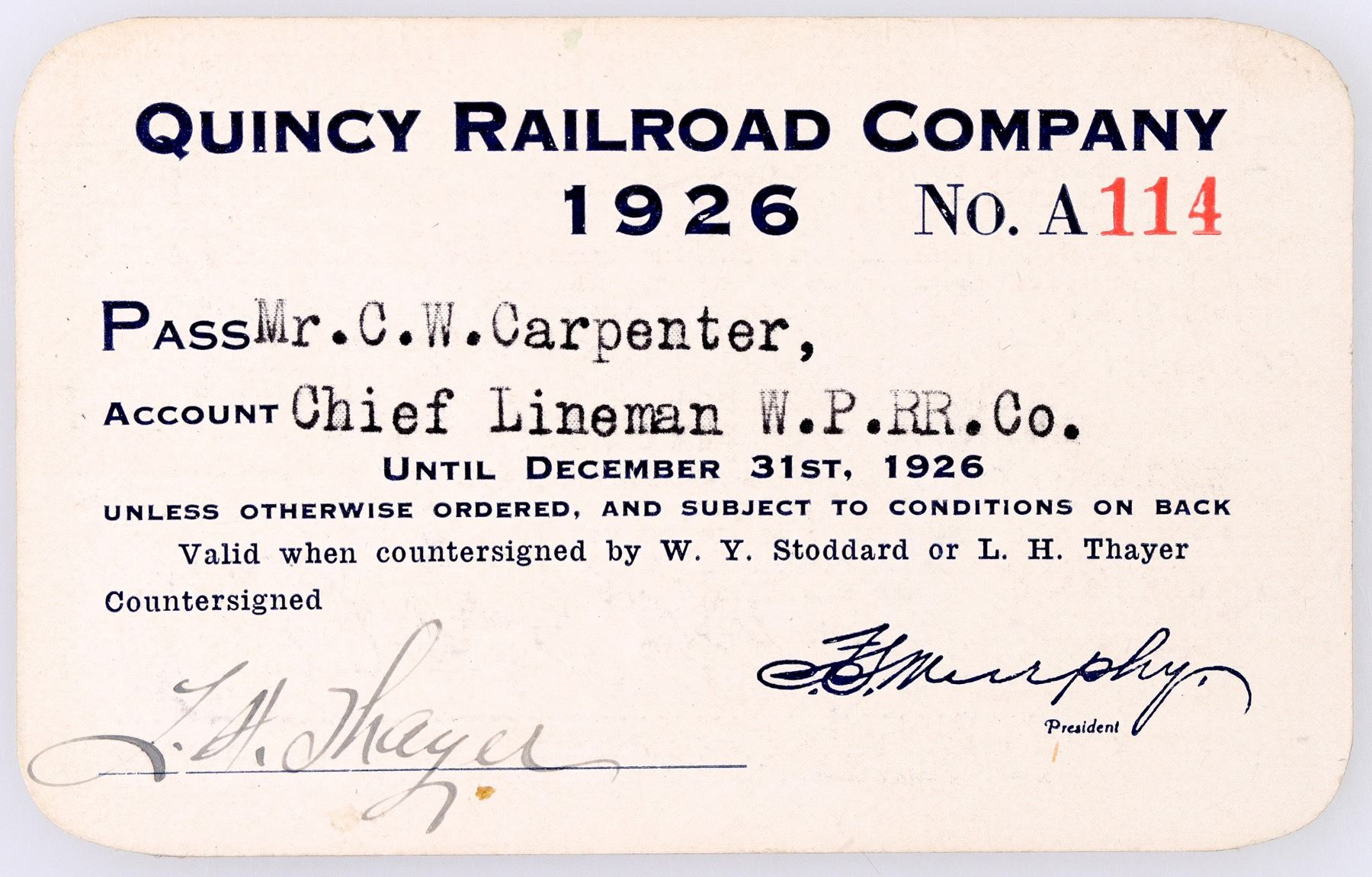 #A114 issued 1926 to C W Carpenter WP RR Co, signed F S Murphy pres., tan cards stock, unk printer. Formed in 1917 by the Quincy Lumber Co. from the purchase of bankrupt Quincy & Western. Known locally as the " Galloping Goose". Currently owned by Sierra Pacific Industries.