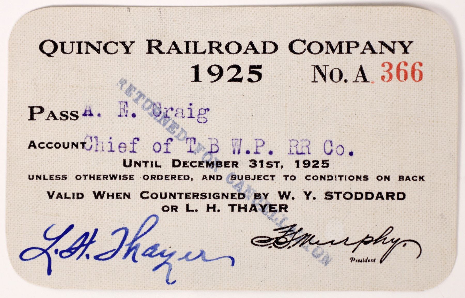Extremely rare Quincy RR pas No. A 366, 1925. Issued to A.F. Craig. CHIEF OF T.B.W.P.RR CO.Signed by L.H. Thayer And F.S. Murphy Pres. (owner of F.S. Murphy Lumber Co, former Quincy Lumber Co.). Cond. of pass is excellent and in protective sleeve. California Quincy 1925 Ken Prag Collection