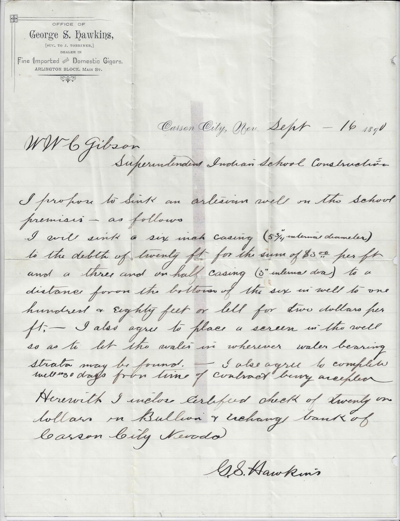 1890. This is a sad tale indeed. George Hawkins was a V&T trained engineer. He work in the Bodie mines and mills, ran the 'Rocket' on Mono Lake, invented a sophisticated system to track the sun during the 1889 solar eclipse, etc. When the state promoted artesian wells, he purchased his own well digging equipment and partnered with Richard Kirman to dig water wells. Among others he dug wells for the Orphan's Home in Carson and Winter's Ranch in Washoe Valley. Lot of three. 1) September 16, 1890 quote from Hawkins to the Stewart Indian School to dig an artesian wells. It is on Hawkins letterhead for the Cigar Store he ran in downtown Carson City. 2) Contract drawn up on September 27, 1890 between Hawkins and the Indian School. 3) 1900 letter from the Department of the Interior at Washington D. C. saying they will not fulfill the contract as Hawkins (who was killed digging the well) had not satisfactorily dug the well. It is addressed to his wife! Extensive background on artesian wells in Nevada, on George Hawkins, the story of his death digging this well. State: Nevada City: Carson City, Ormsby Date: 1890 HWAC# 99453