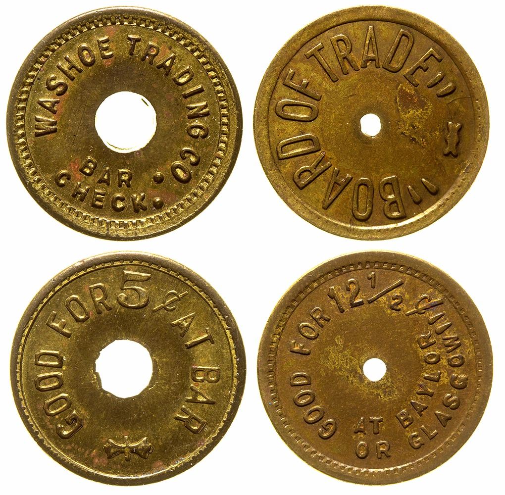 1) Board of Trade / / GF 12-1/2c / At Baylor / Or Glasgow. Round, brass, 20mm, center hole. 2) Washoe Trading Co. / Bar Check // GF 5c at Bar. round, brass, 20mm, center hole. State: Montana City: Baylor & Washoe Date: FHWAC#: 41543