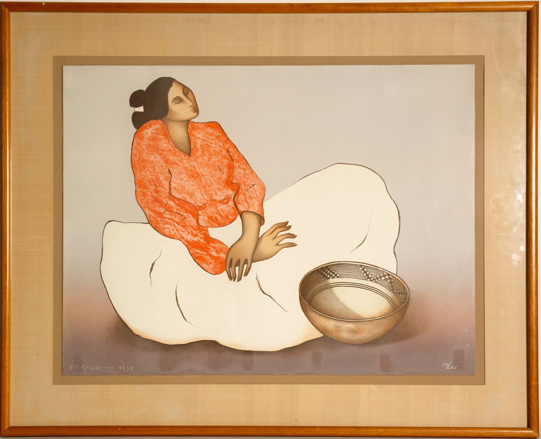 Beautiful double matted Litho of Mimbres, framed approx 37" x 35". "Rudolph Carl Gorman (July 26, 1931 – November 3, 2005) was a Native American artist of the Navajo Nation. Referred to as "the Picasso of American Indian artists" by The New York Times,his paintings are primarily of Native American women and characterized by fluid forms and vibrant colors." (Wikipedia). Signed & numbered 56/225.
