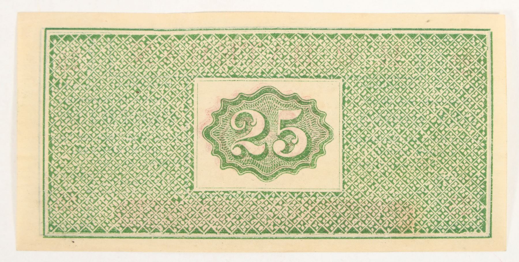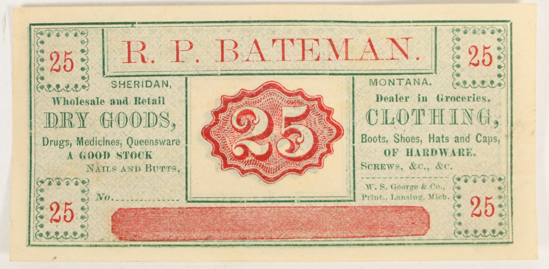 R. P. Bateman, Sheridan, Montana, 25¢ Scrip, c.1890s. Unissued remainder; almost uncirculated. Federal law forbids issuing this type of note, but often local needs superseded the law. Ex.- Currency Auctions of America, Rosemont, IL, May 15-16, 1998, Lot 620. Rarity 7 (one to five known). John J. Ford Collection catalog Part XX. Douglas McDonald Collection.