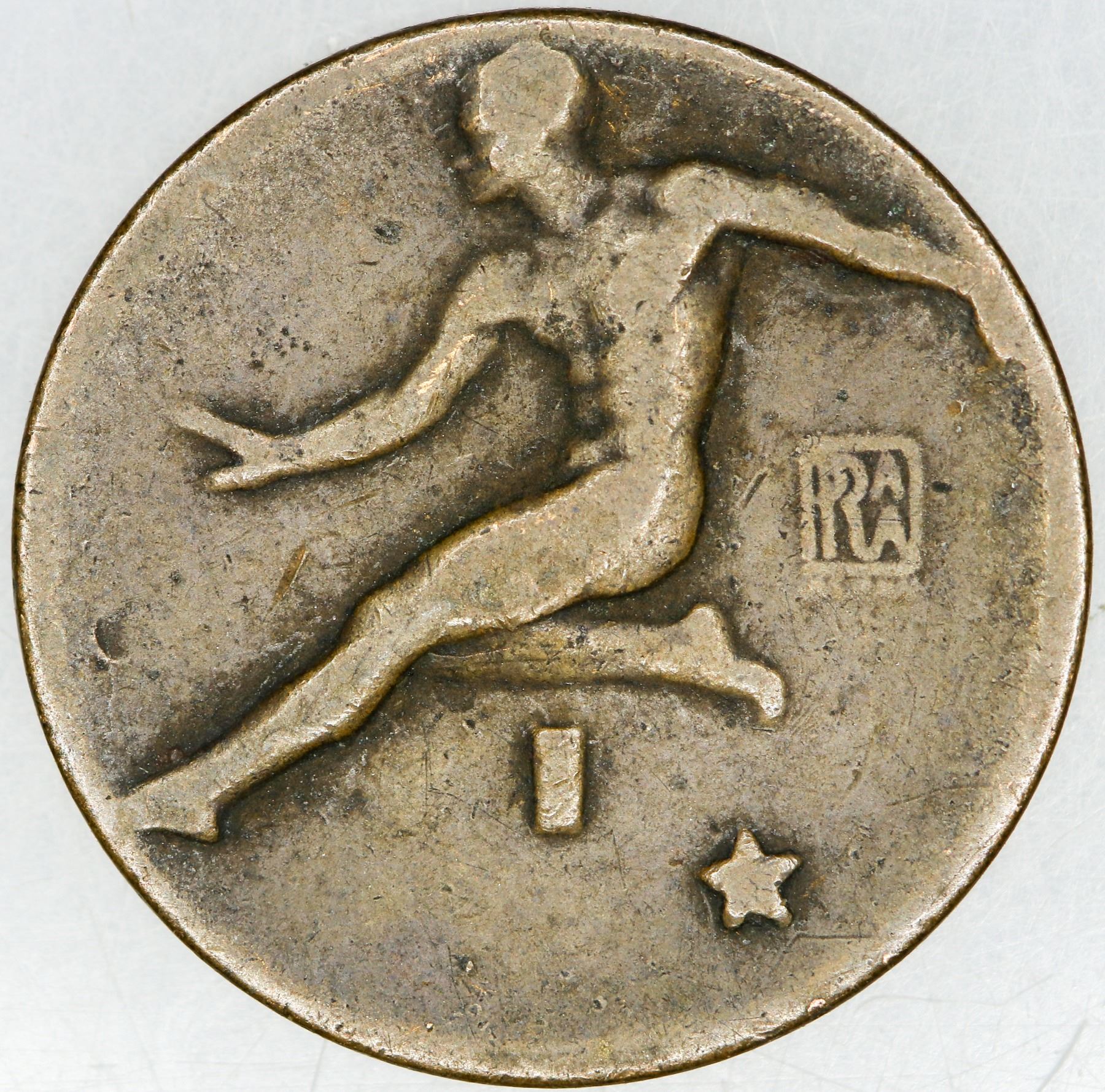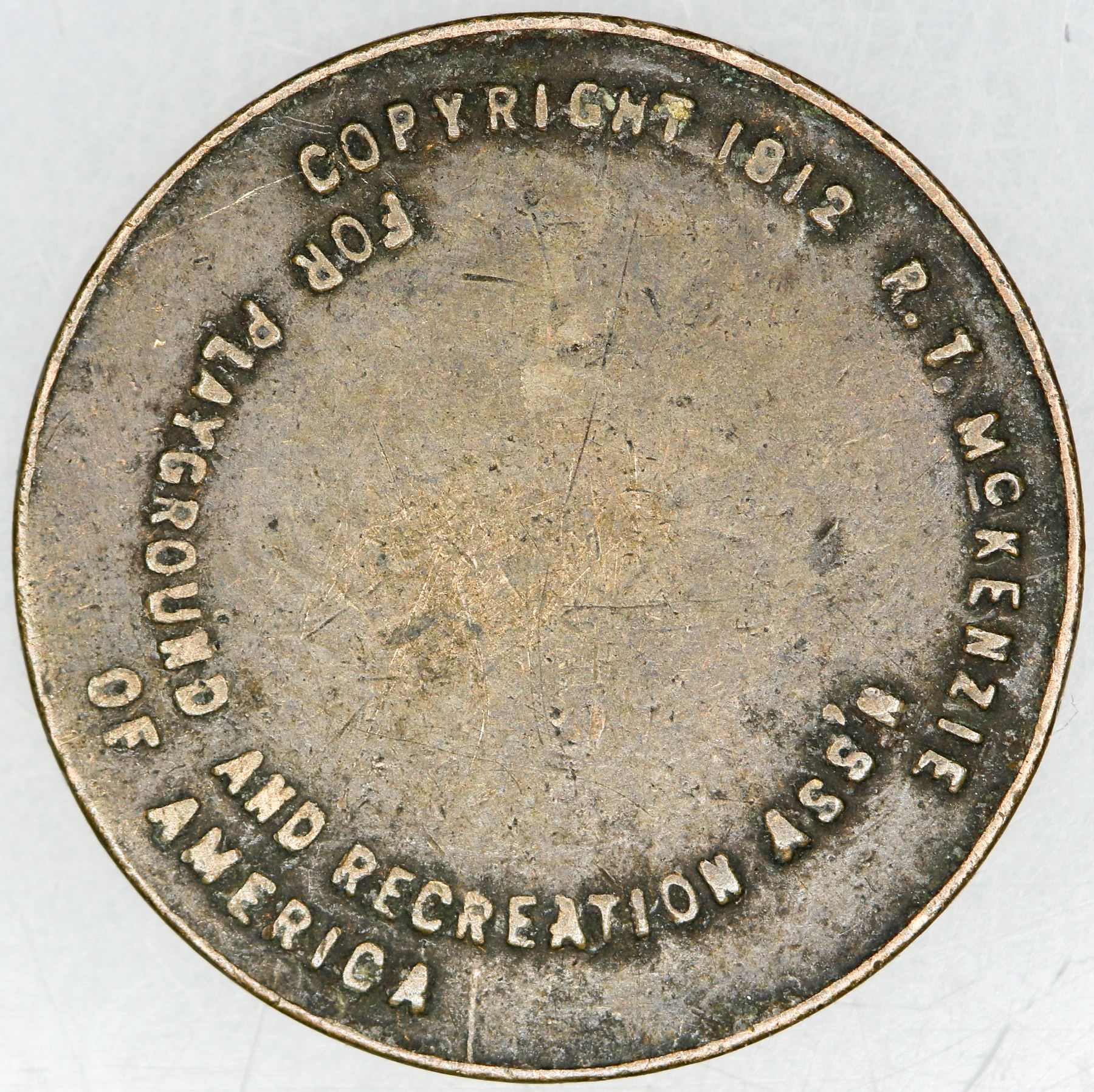 Small bronze medal for what appears to be Track & Field. The Obverse shows a runner or hurdler in action. The reverse indicates 'For Playground and Recreation Assoc. of America.' Also indicates Copyright 1912 by R.T McKenzie. Well-worn, measures approx. 3/4" in diameter.