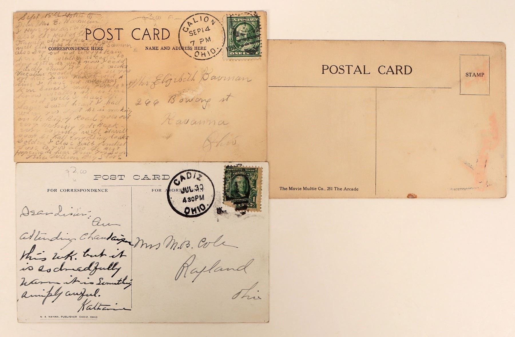 Trio of RARE Ohio postcards, c1910s. Includes: Ohio's 7 Presidents, with Taft as the current president, advertisement for a general store in Cleveland, unused; Famous citizens of Harrison County - George A. Custer, John A. Bingham, Matthew Simpson - Cadiz cancel, 191?; 1910 Galion Street Fair, Galion canceled.
