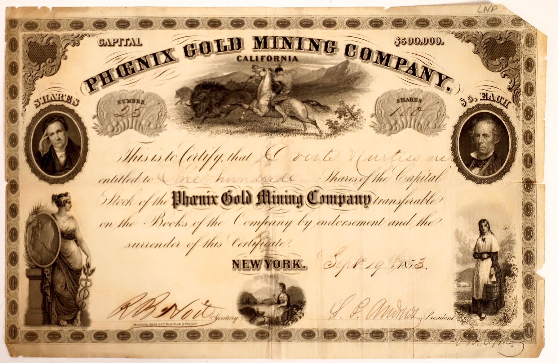 Early California Gold Rush stock certificate # 25 to Evert & Curtiss for 100 shares in 1853. Signed by LP Anderson president pro tem and RB Holt secretary. Six vignettes including a Native American dashing through the countryside on his horse. Creases. a bit of foxing along border. Top right corner is missing. Property was originally Sneath and Clay Mine; in its heyday produced $180,000. Holt may be related to MF Holt who an for Nevada City mayor in 1851. This area was a very important mining location during the height of the California Gold rush. Nevada City California Franklin Collection