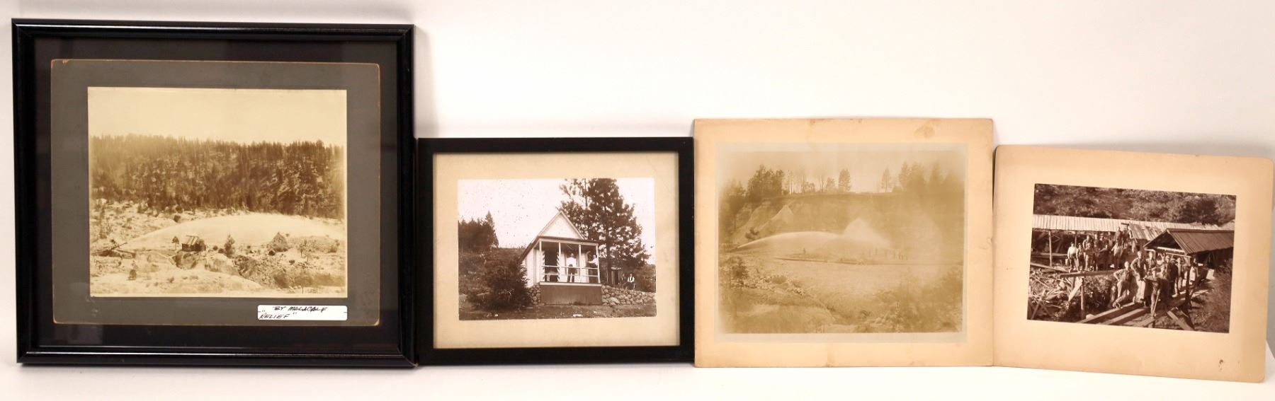 4). Wide photograph shot of the Relief Hill area taken by Malacalf titled "Relief." The photograph shows a small mining camp with a singular building and other equipment. There is a large pipe shooting water over a field creating a fine mist. The picture is 9.8 x 8 inches, the picture frame is 13 x 15 inches. SEE THE MINING SECTION FOR OTHER RARE, EARLY MINING RELATED PHOTOS AND MORE.