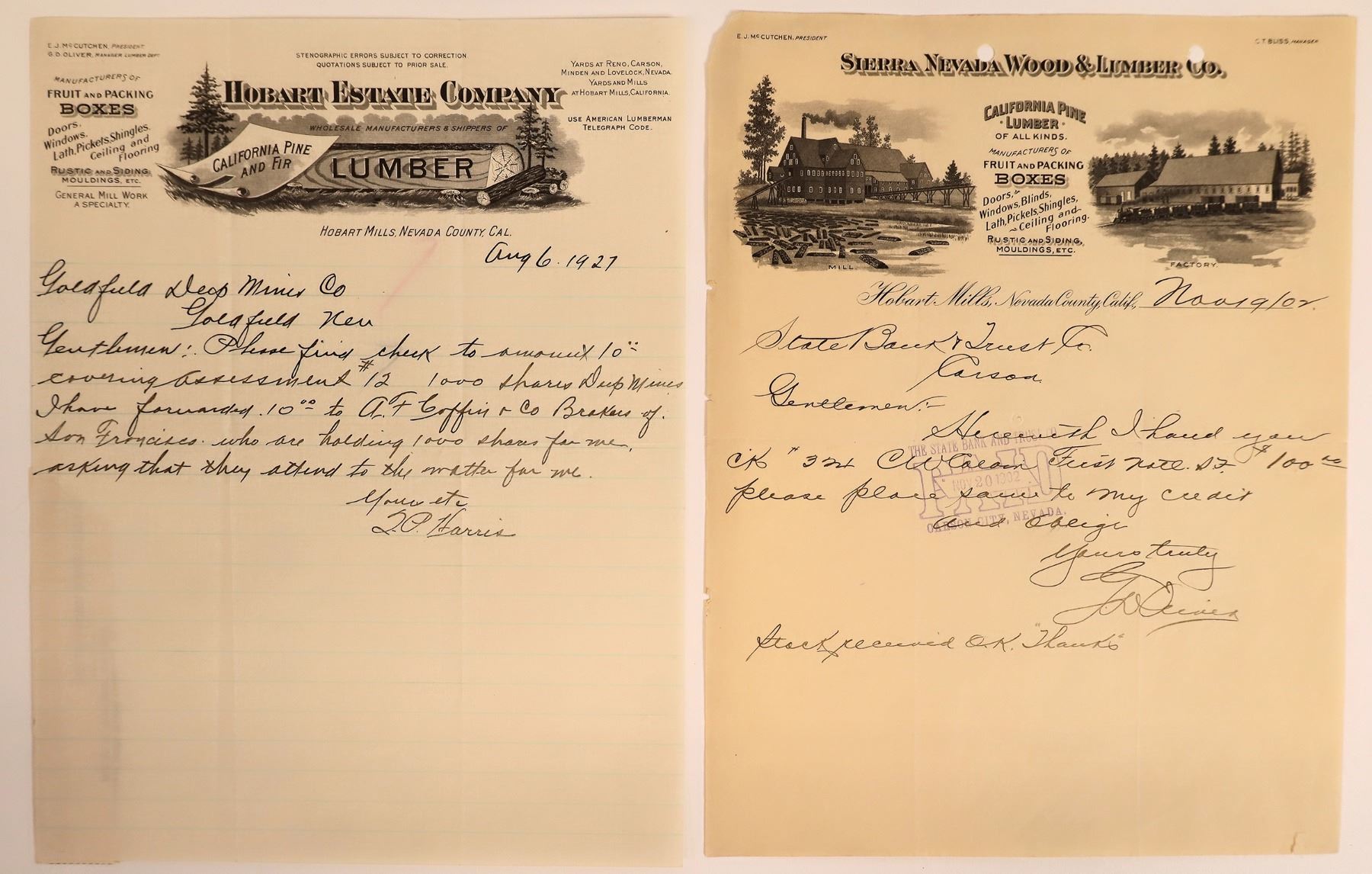 Lot of 2 different rare pictorial lettersheets for the Sierra Nevada Wood & Lumber Company, operating at Hobart Mills, CA (in Nevada County, north of Truckee). 1) 1902 letterhead to the bank in Carson City. Vignettes of factory and mill. CT Bliss listed as manager (son of DL Bliss). 2) 1927 letterhead for the Hobart Estate Company. Message to the Goldfield Deep Mines Company. Vignette of cut log. The Sierra Nevada Wood & Lumber Company was a lumber company operating initially out of Lake Tahoe. They helped supply the Comstock mines with lumber. When the mining died down, they relocated men and machinery and formed the camp north of Truckee. Initially called Overton, it was renamed Hobart Mills. Both names honor key Tahoe lumber figures.