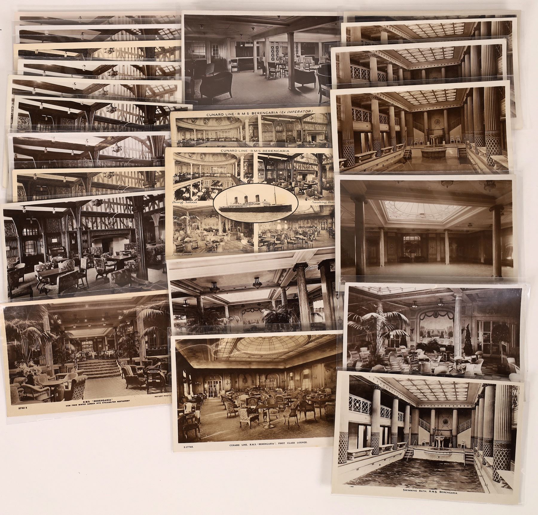 A lot of 20 RPC's of Cunard Line's HMS Berengaria. She has the distinction of being Cunard's first Queen, named after Queen Berengaria, the Queen Consort of Richard the Lionheart. Launched in 1912 and ended service in 1938. These cards show mostly the luxurious interior compartments of the ship. Some are used, some blank. Please see photos for more detail and condition.