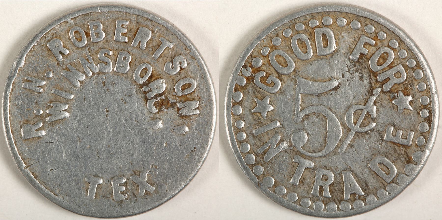 Round aluminum 18mm R.RN. ROBERTSON / WINSBORO, / TEX. // GF / 5C / IT. Very rare. HWAC# 62364 Date: Location: Winnsboro, Texas