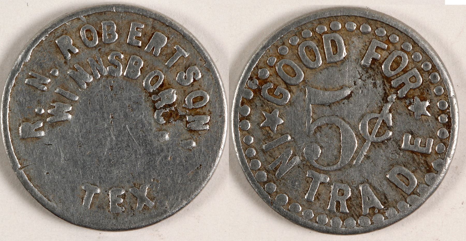 Round aluminum 18mm R.RN. ROBERTSON / WINSBORO, / TEX. // GF / 5C / IT. Very rare. State: Texas City: Winnsboro Date: HWAC# 62364