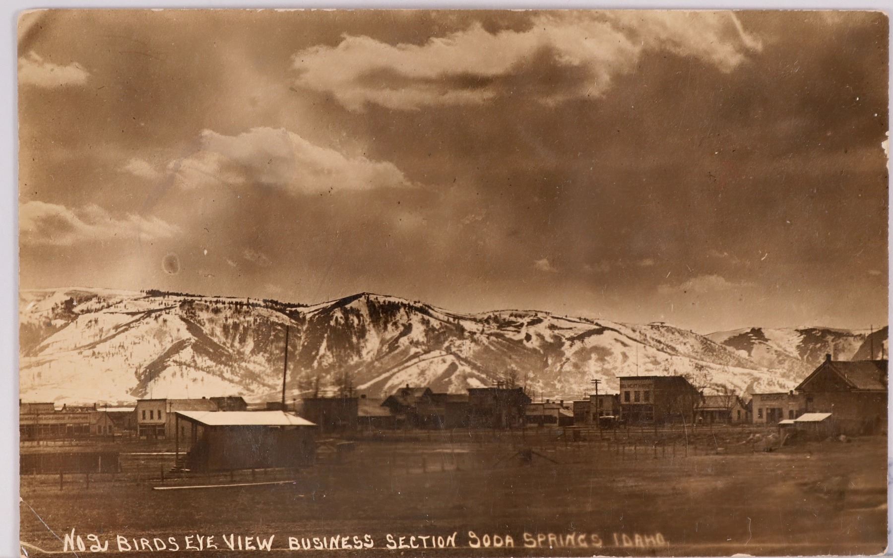RPC, black/white, no borders "No. 3 Birds Wye View Business Section Soda Springs, Idaho" Snow capped mountains in rear background, cloudy with storm approaching/buildings look like the late 1800s, very dark image of buildings surrounded by barbed wire fencing, dirt roads surrounding town. No cancellation, writing on rear mentioned the Rodeo "grand stand" in picture.