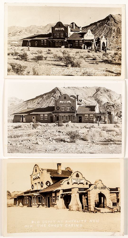 Three different views of train depot (Ghost Casino) in Rhyolite; 2 photos by Frashers Fotos. (Prag Collection) City: Rhyolite State: Nebraska Date: 1930's-40's ID# 44619