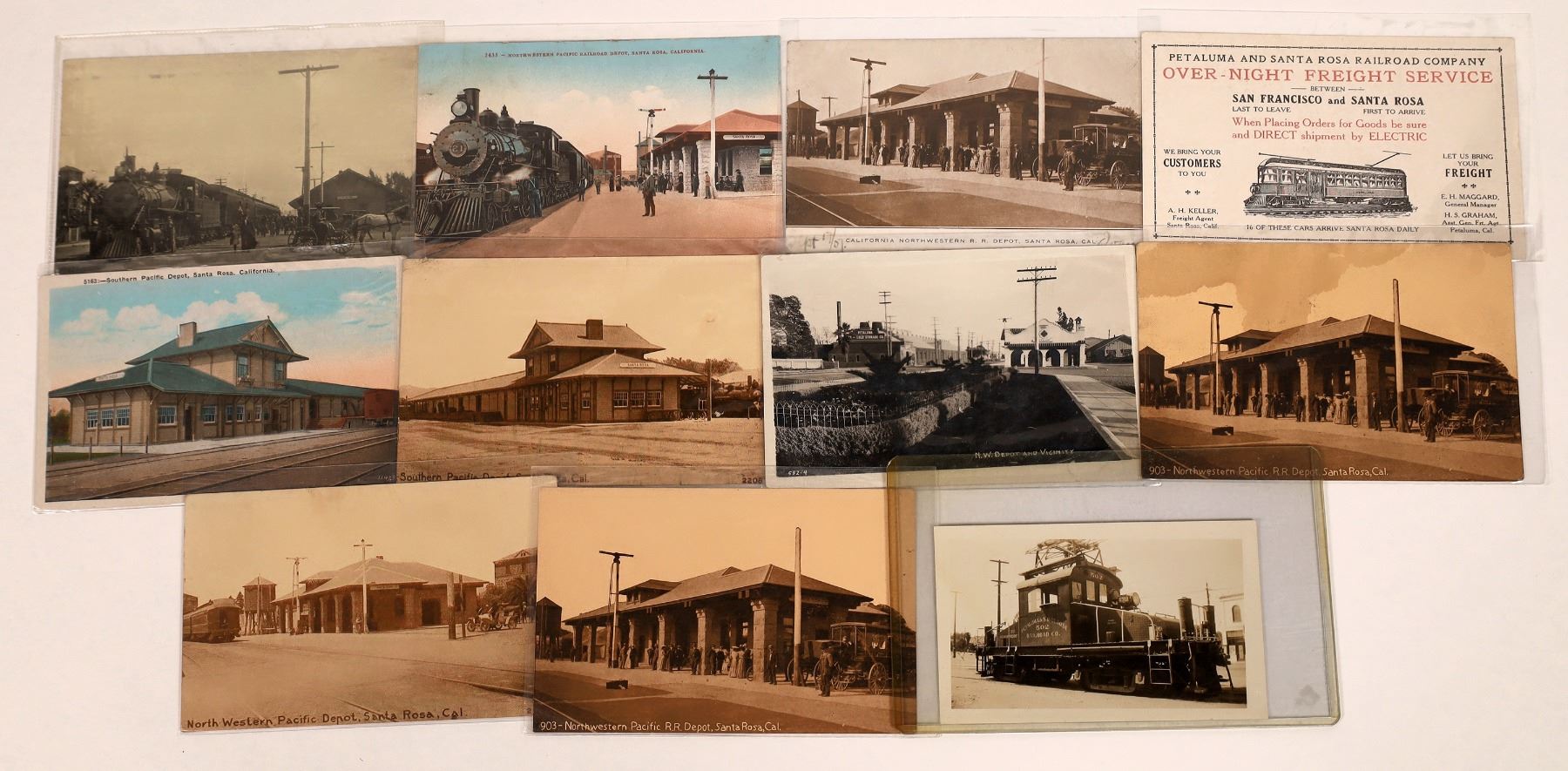 RPC's showing the SP Railroad depot in Santa Rosa and Petaluma as well as the Northwestern Pacific RR depot in Santa Rosa. For film fans, this was the same depot used in Alfred Hitchcock's "Shadow of a Doubt."Some are used, some are blank. Please see photos for more detail.