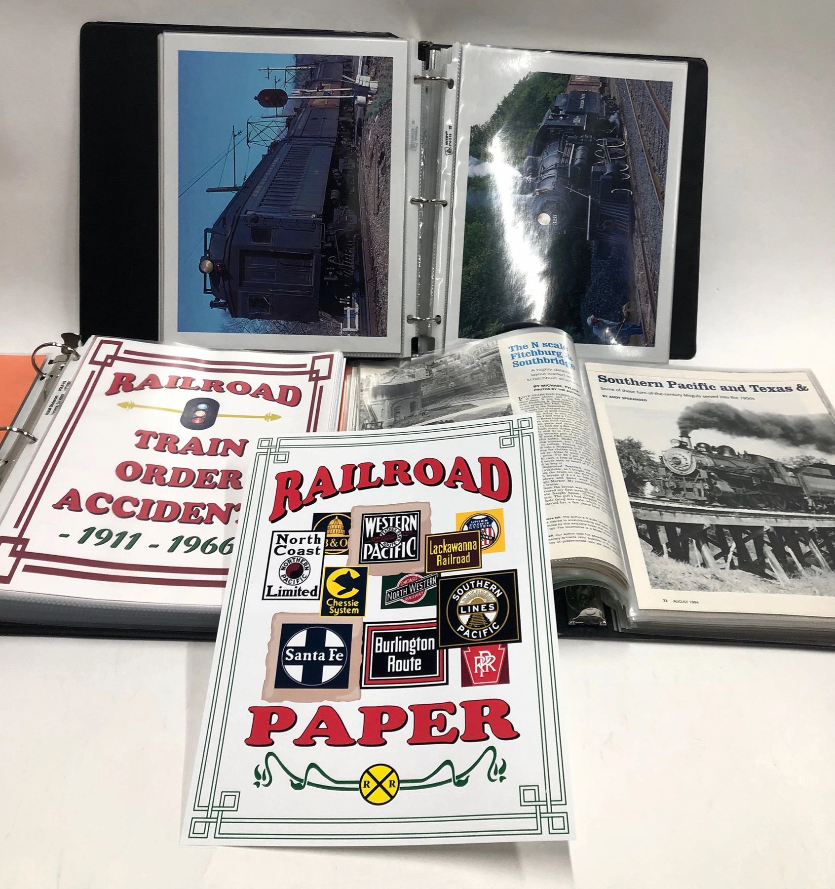 Three notebooks full of fantastic RR info. One notebook with perhaps 100 8 x 10 color photos of engines around the country, modern; one notebook of reports and stories, well researched, on railroad wrecks, perhaps 100pp; one notebook of articles carefulkly clipped from model railroader magazine and others.