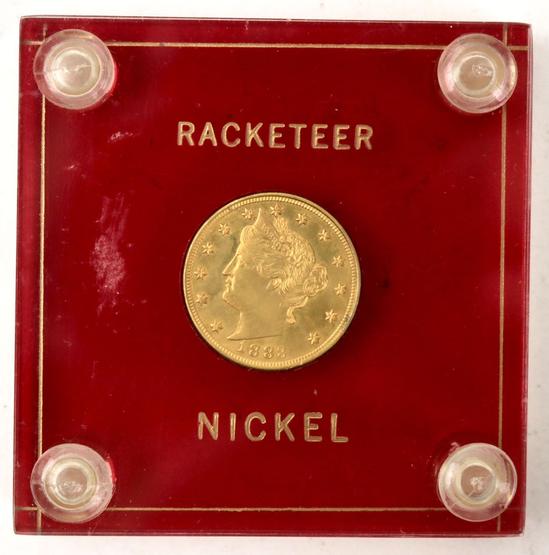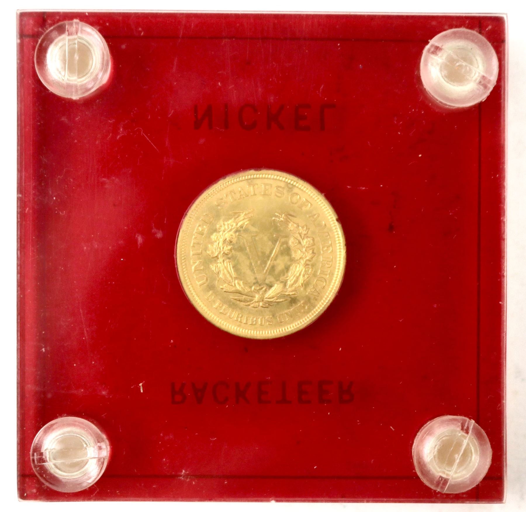 The infamous "racketeer nickel": 1883 Liberty nickel, gold plated to pass as a five dollar gold piece. Elegantly mounted in a red Capitol Plastics case. Brilliant uncirculated condition. When the Liberty Head nickel made its debut in 1883, it featured a "V" on the reverse but no indication of denomination. Con men quickly gold plated them and passed them off a five dollar gold pieces. Soon the U. S. Mint added the word "cents" to the coin and they continued to be minted until 1913. A beautiful example of a famous American coin!