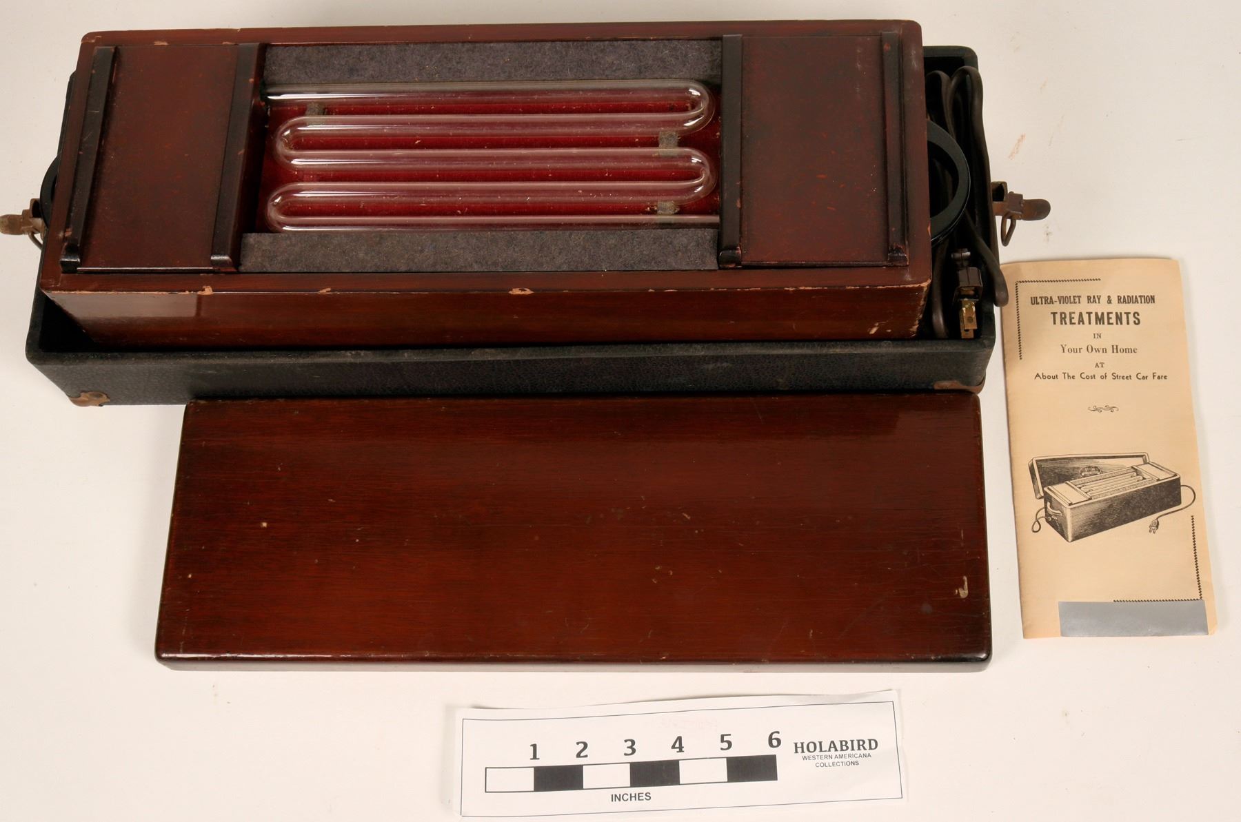 This is an example of a get quick scheme, using the power of propaganda and a brightly lit up bunch of tube lighting. This is a Ray & radiation instrument that purports to be a cure for strained and painful, muscles, joints and nerves. Sold by C.P. Rolfe of Redondo Beach, CA. This device was offered in installment payments, which made it attractive to consumers during the Depression. About the only thing this unit does is light up and give someone the illusion (Along with well-written directions), that you are indeed getting better. This piece is in good condition. See photos for more details.